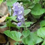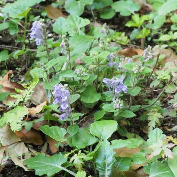 小さな帽子のような薄紫色の花をたくさん咲かせます。 葉には短い毛がたくさん生え、 ビロードような質感です。