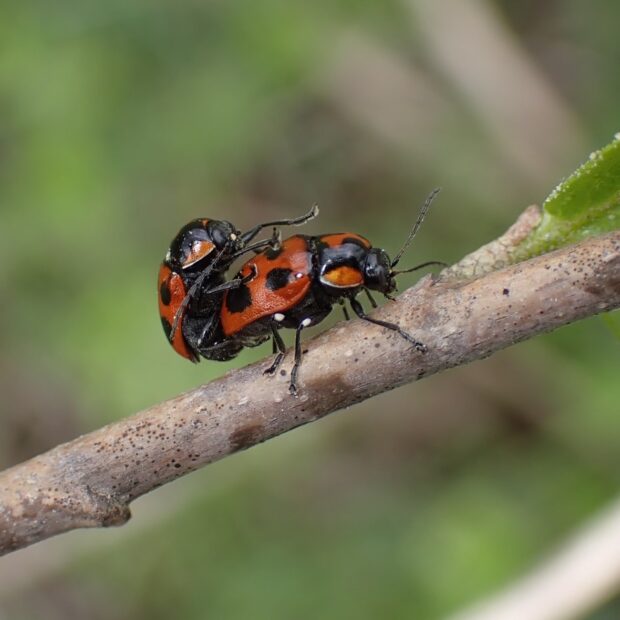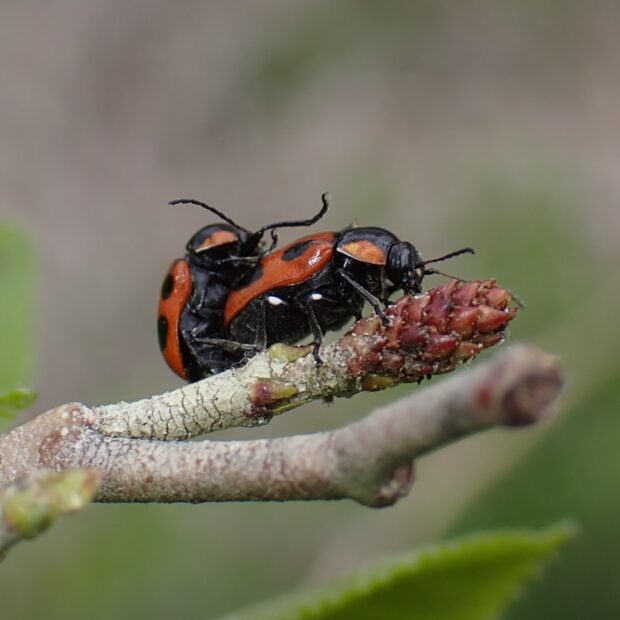 ずんどう体型(円筒形)のツツハムシの仲間。 赤い体に黒い模様があり、 テントウムシに擬態しているとのこと。 メスは産んだ卵をフンでくるみ、 地面にぽとっと落とします。 ふ化した幼虫は、 フンのケースの中で育ちます。