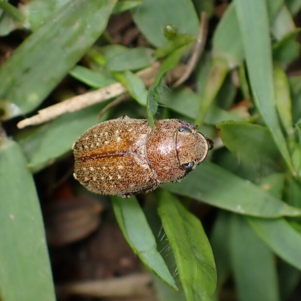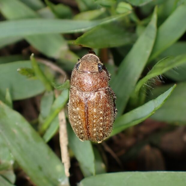 コガネムシの仲間。 市街地の公園などの樹木で普通に見られ、 明かりにやって来ます。 茶色の体は灰黄色の短い毛でおおわれ、 大きな黒い複眼を持ちます。 かつてはチャイロコガネと呼ばれていました。
