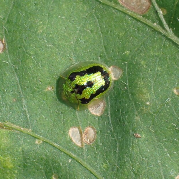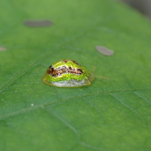 カメノコハムシの仲間。 金緑色で黒や褐色のU字の模様がありますが、 模様がないものもいます。 南西諸島などで普通に見られる南方系の昆虫ですが、 日本各地に広がりつつあり、 近年千葉県でも発見されました。