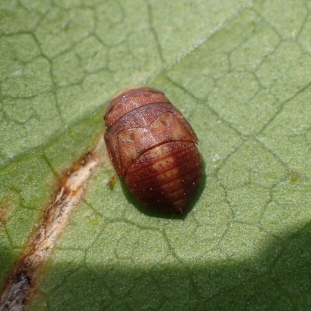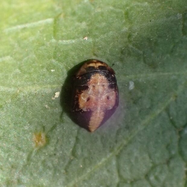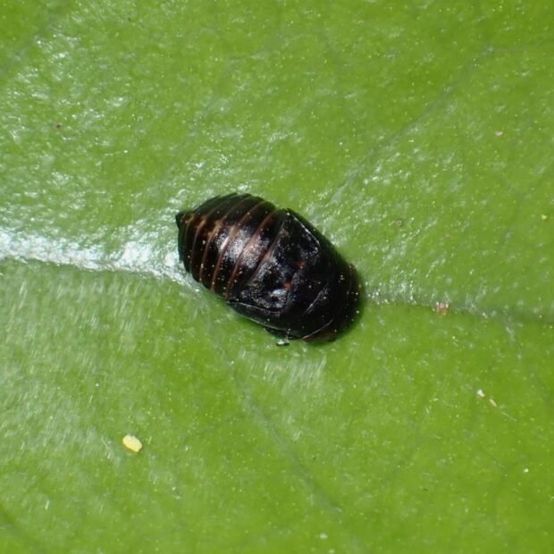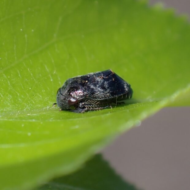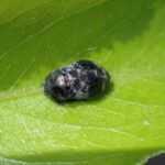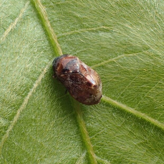 楕円形のヨコバイの仲間。 体は光沢のある黒色~茶色。 はねに小さな白い紋がありますが、 この白い紋は個体によりさまざまで、 違いが見られます。 危険を感じるとピョンと跳びます。