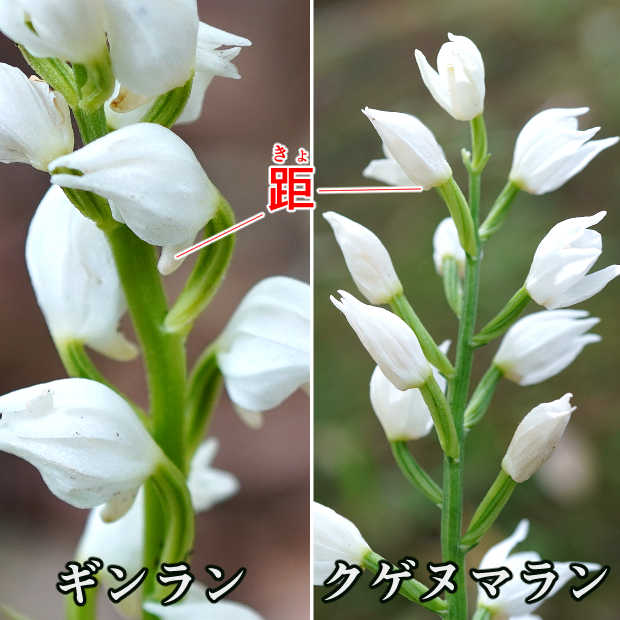 より普通に見られるギンランが似ています。 ギンランはより株が小さくて、 距が長く、 花があまり変色しないことが特徴ですが、 時に区別しにくいものも見られます。