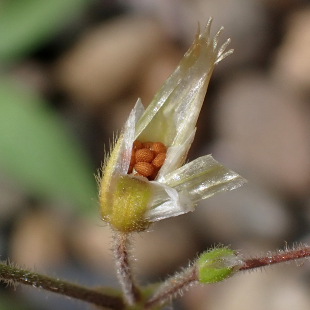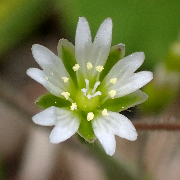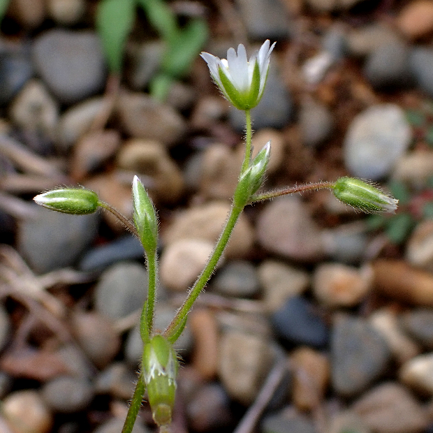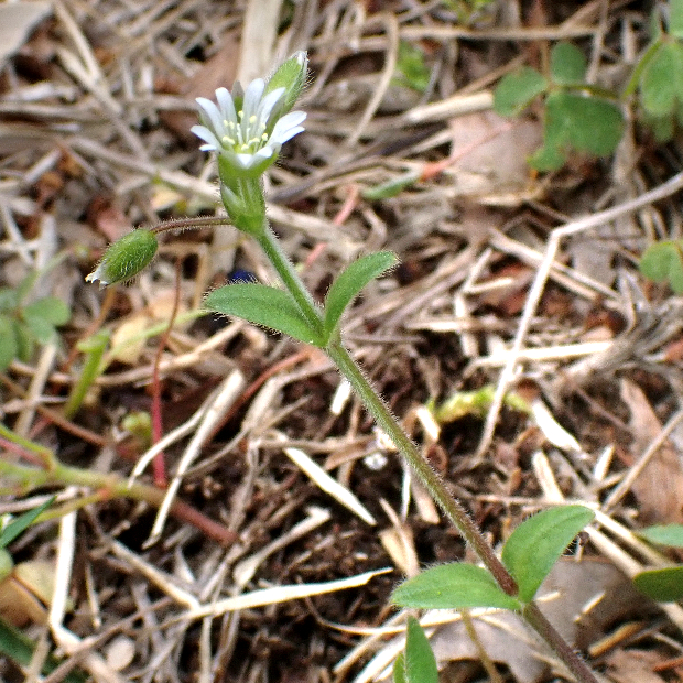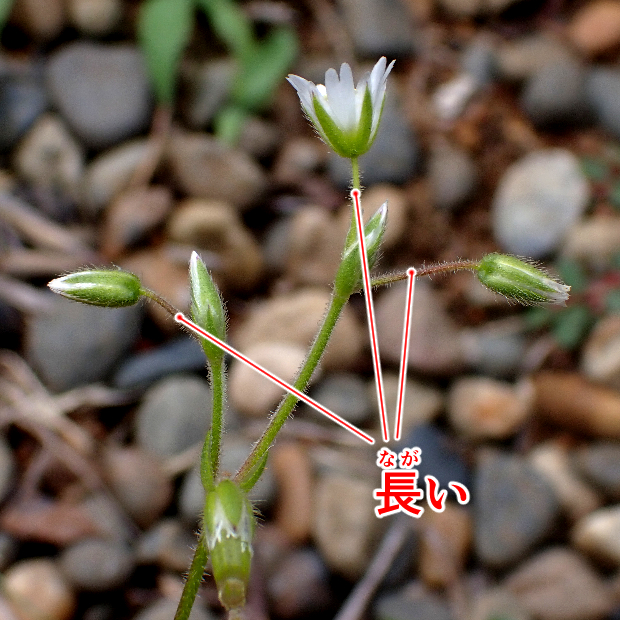 春の道端や田んぼの畦などに生える白花の草。 都市公園などでよく見かけるオランダミミナグサに近い仲間で、 それよりも茎や花の柄が長くて、 花が少ないのでひょろっとした感じがします。 名前の耳菜(ミミナ)は、 葉の形がネズミの耳に似ていることが由来です。