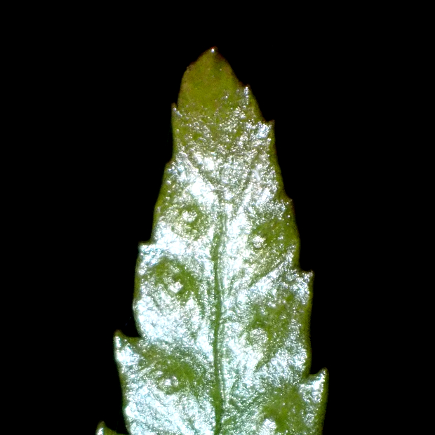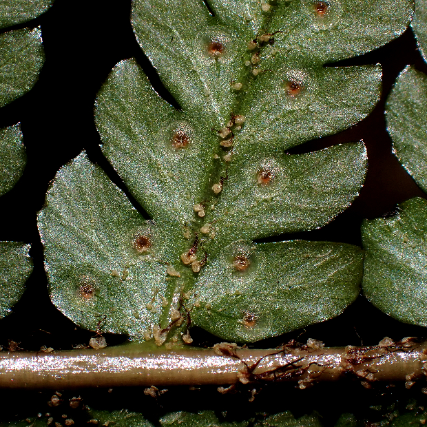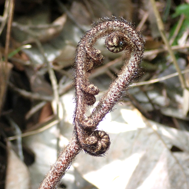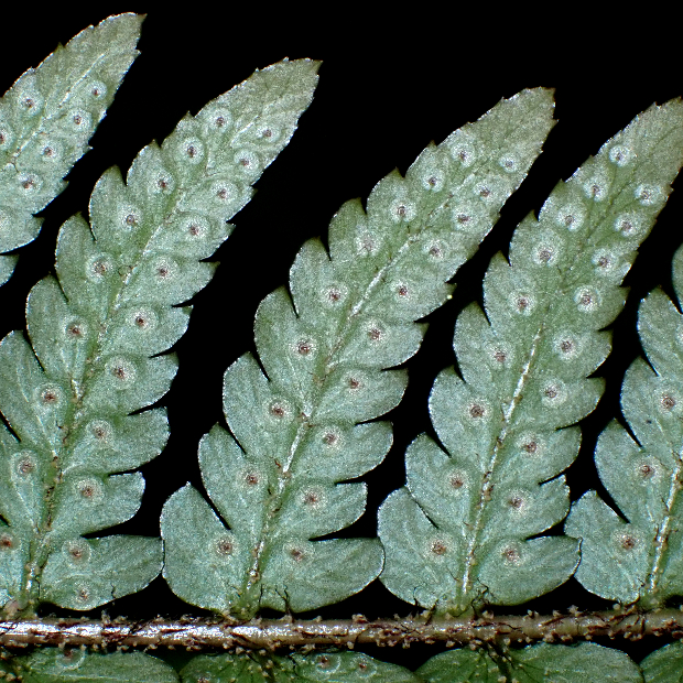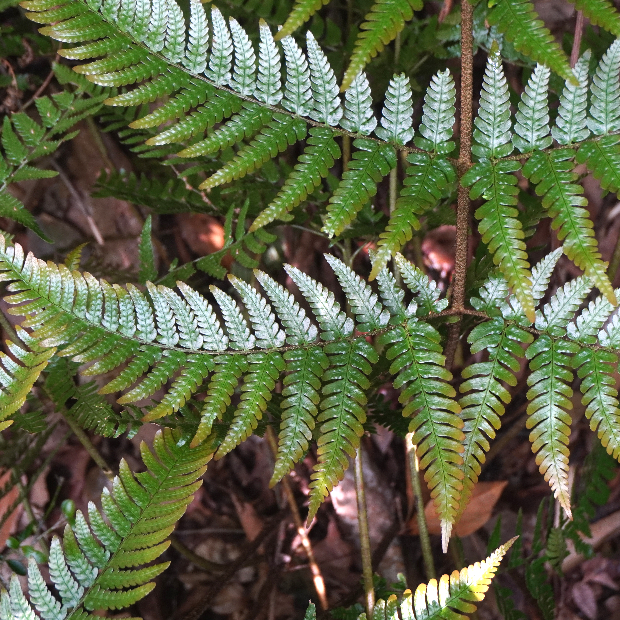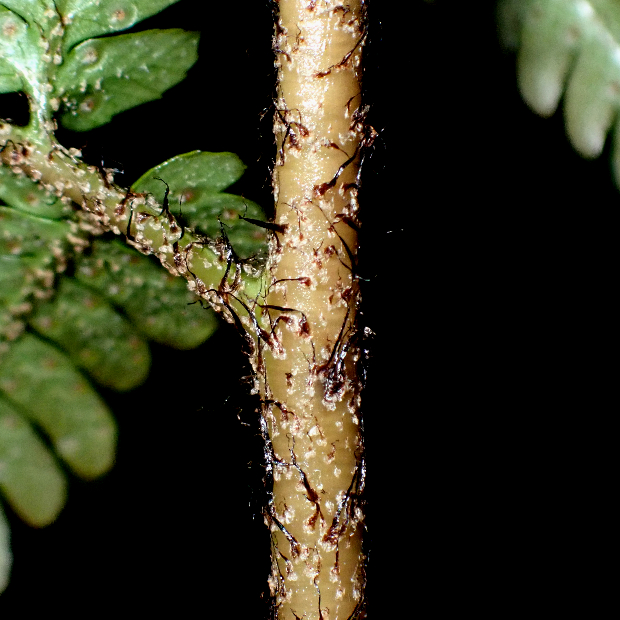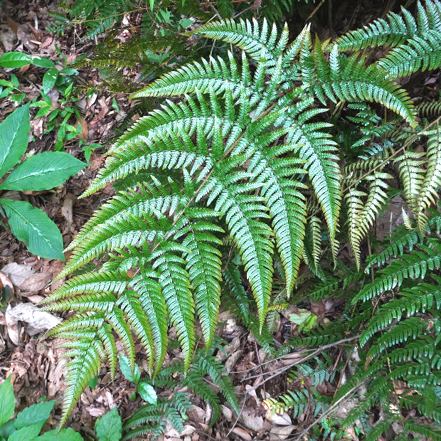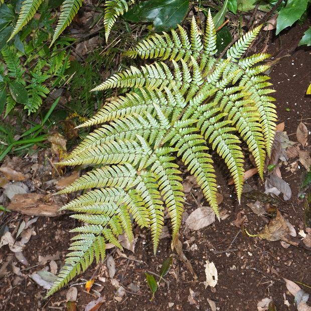 オオイタチシダとハチジョウベニシダの雑種起源で遠い昔に生まれたと考えられているシダで、 ベニシダっぽさを受け継いだ特徴がいくつか見られます。
