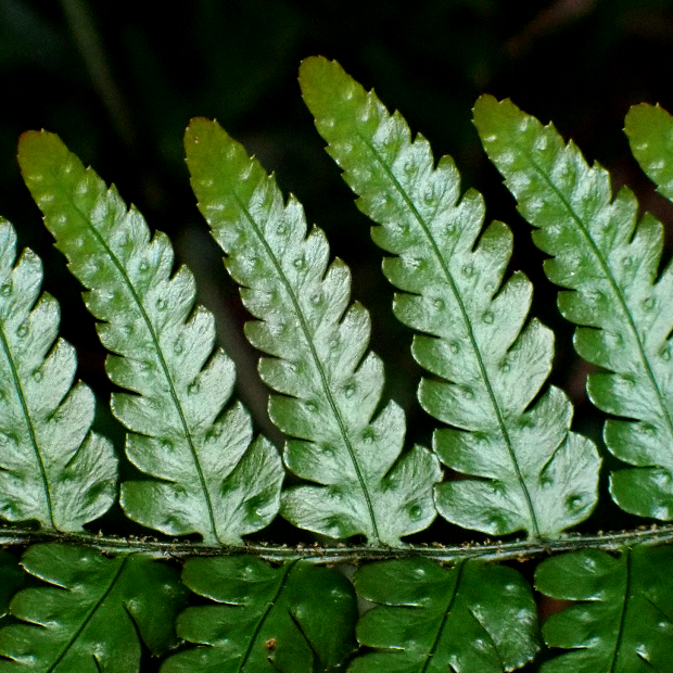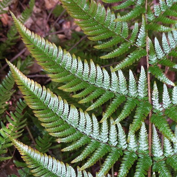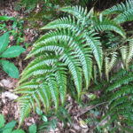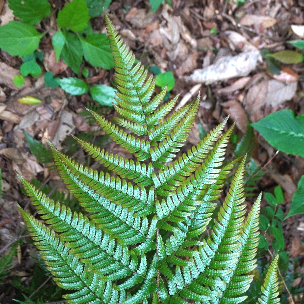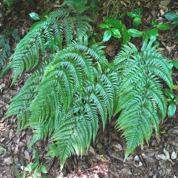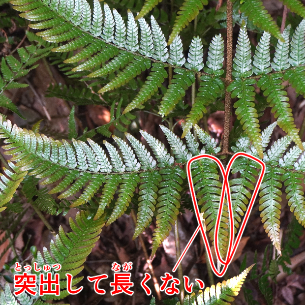 都市公園でもよく見られるシダ。 同じく身近なオオイタチシダよりも大きくてタテに長く、 葉のフチは平面的で、 葉の一番下の小羽片は突出して長くならないといった特徴があります。 株によっては、 葉裏の包膜が紅色になります。