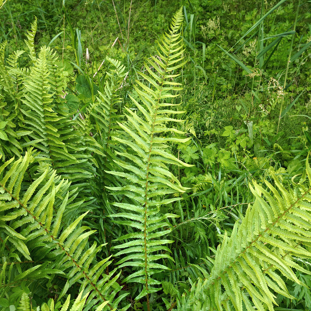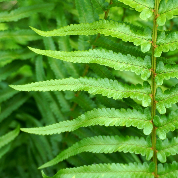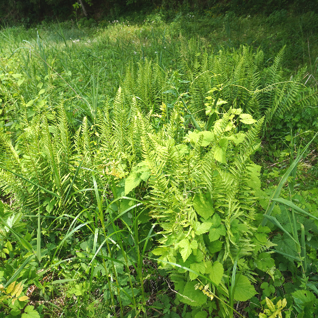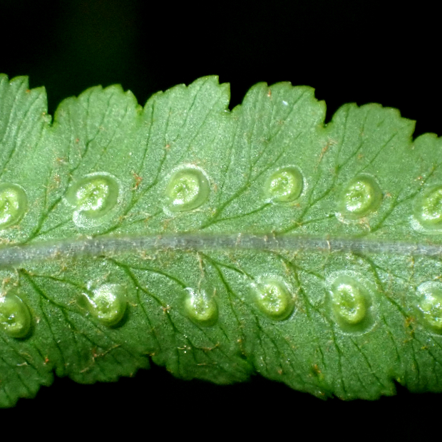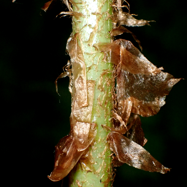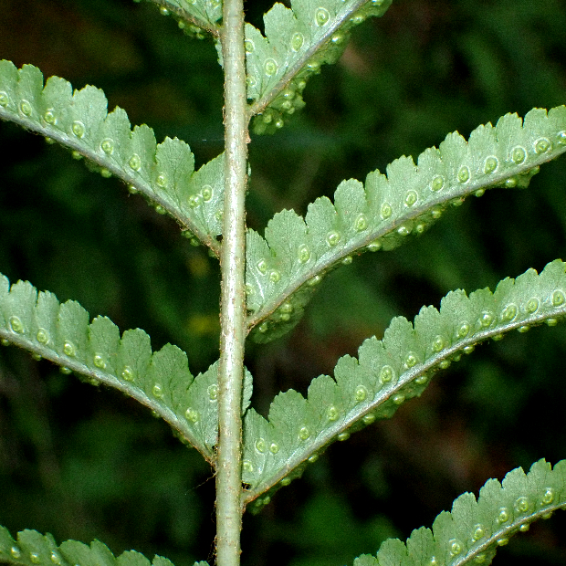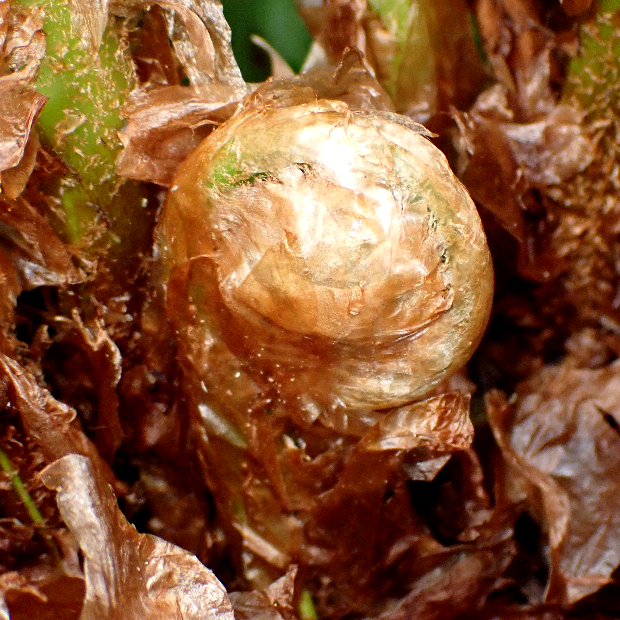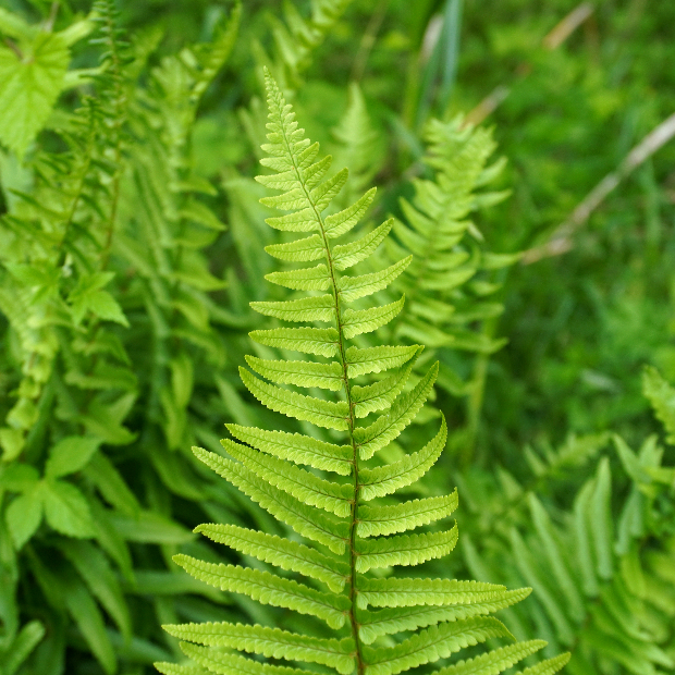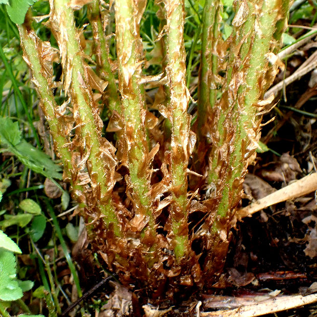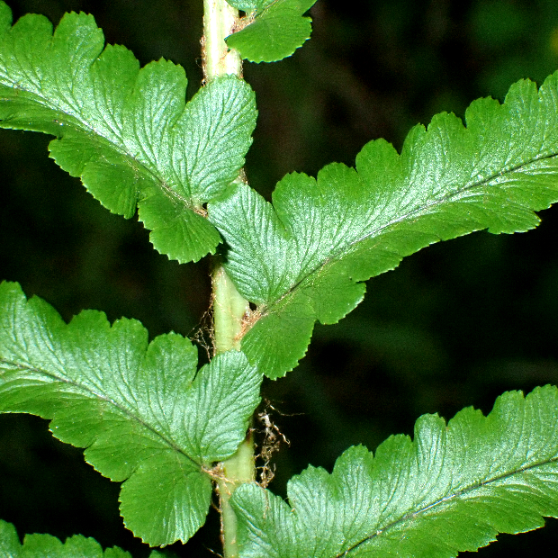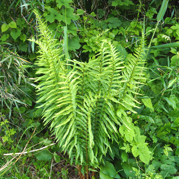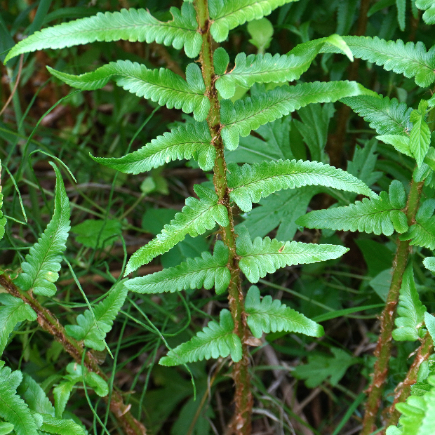涼しい地域の湿った谷沿いなどで見られる大きめのシダ。 葉は根茎から立ち上げるように出て、 タテに長く、 下ほど羽片が短くなります。 名前のヘゴにはシダの総称的な意味があり、 ヤシの木のようになるヘゴ科のヘゴとは分類が大きく異なります。