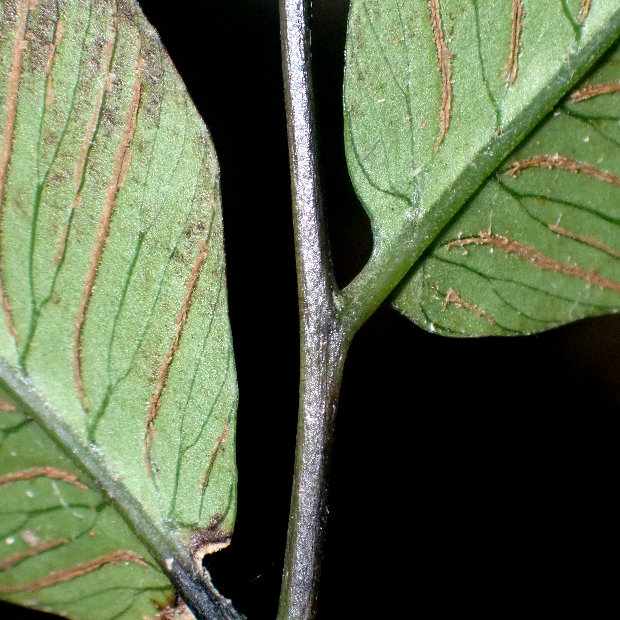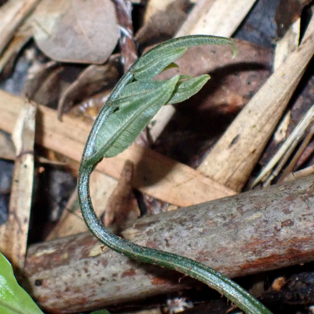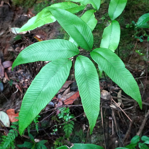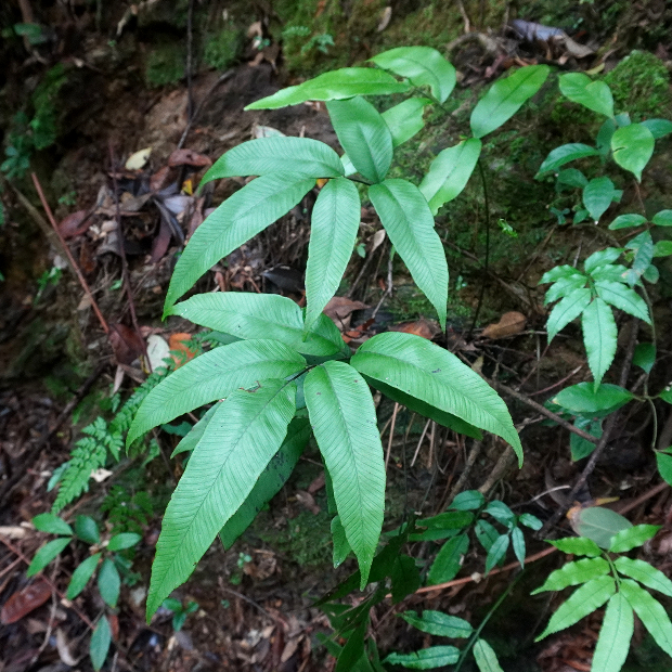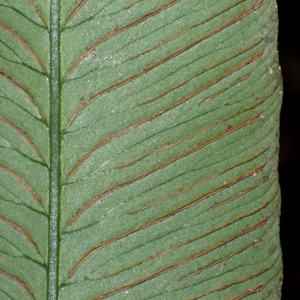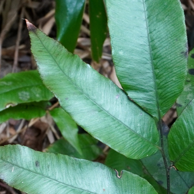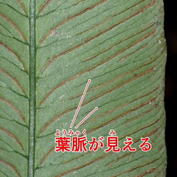 南方に分布する革のような質感のシダ。 似た仲間がいくつかありますが、 本種は羽片が大きく切れ込まず、 葉裏の葉脈がはっきり見えます。