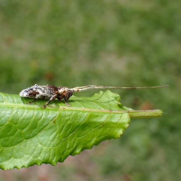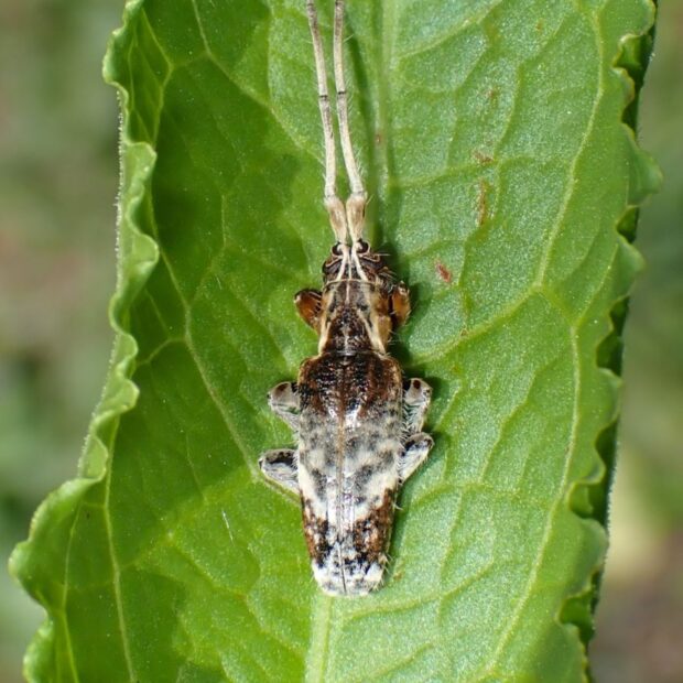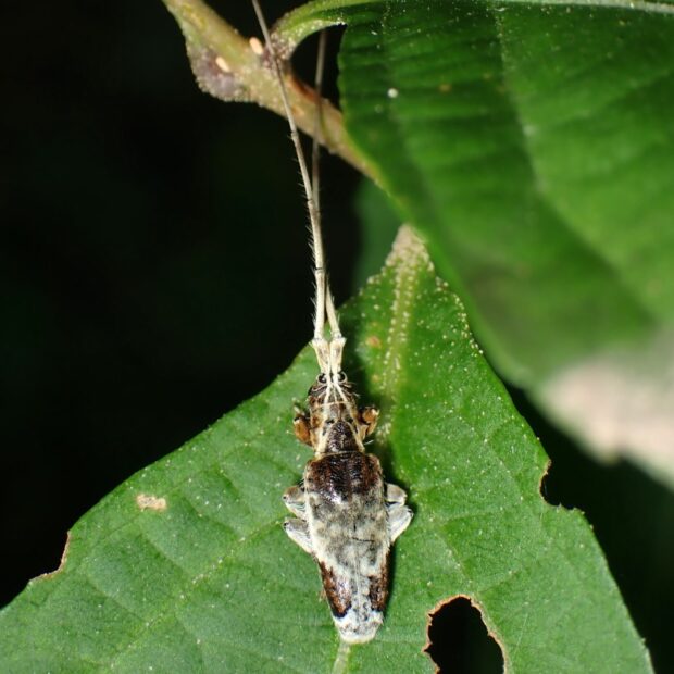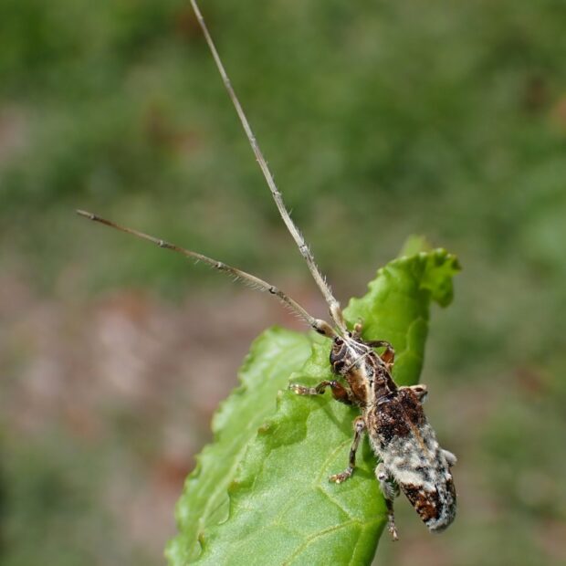 鳥のフンのような複雑な模様のカミキリムシ。 平地~山地に生息しています。 体は黒いですが、 白い微毛が複雑な模様を作っています。 触角が長く、 オスは体の約3倍、 メスは体の約2.5倍の長さがあります。 日本固有種。