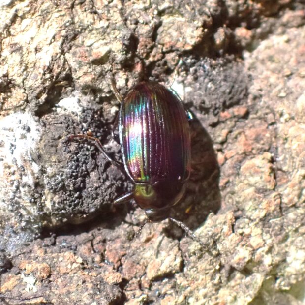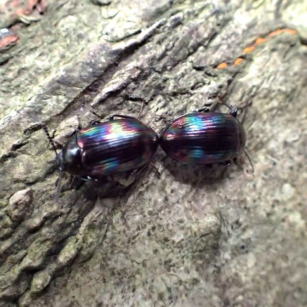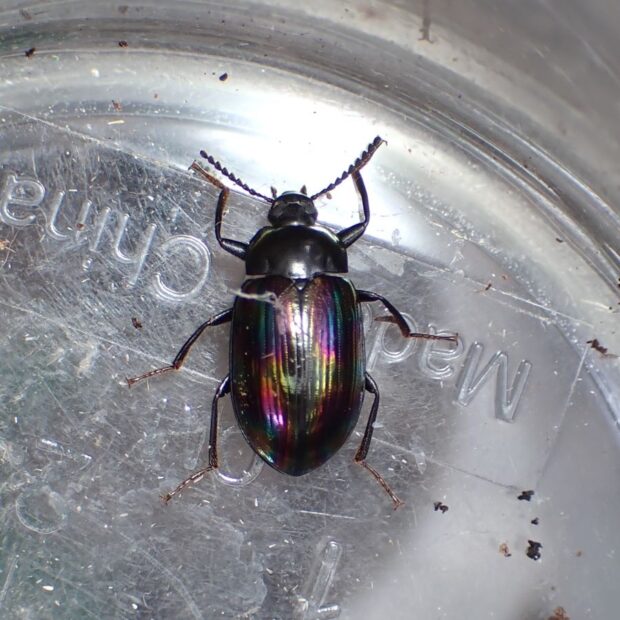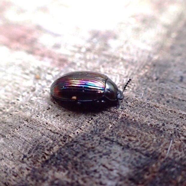 虹色の光沢をもつゴミムシダマシの仲間。 ナガニジゴミムシダマシ類では小型で、 雑木林の倒木などで普通に見られます。 似た種類がいるので、 識別には注意が必要。