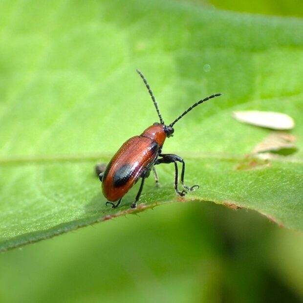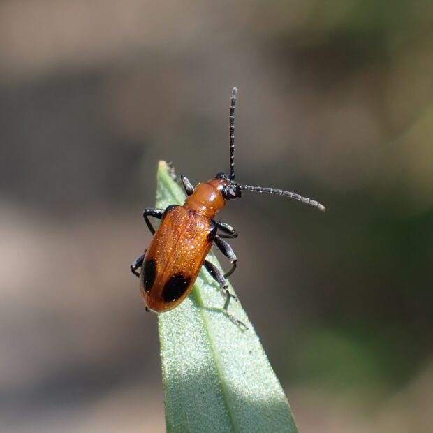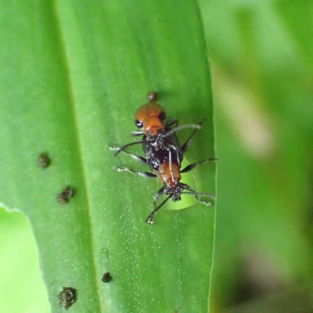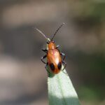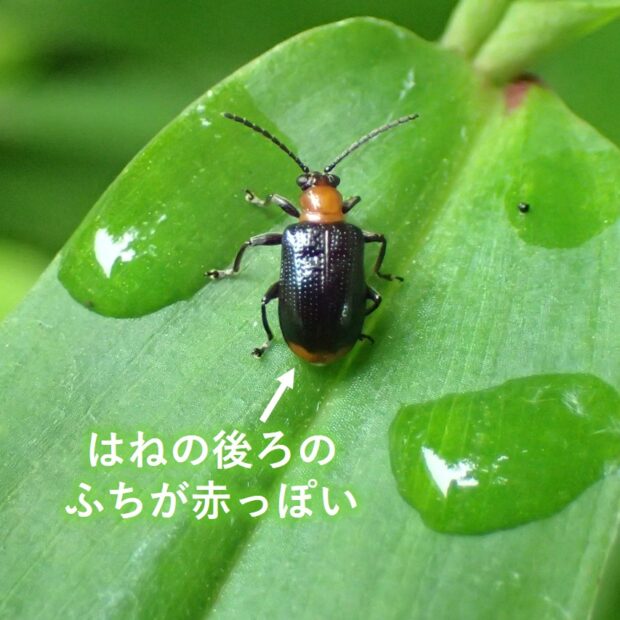 ツユクサで見られるハムシ。 色や模様はいろいろで、 カワリクビボソハムシとも呼ばれます。 上翅は藍色~オレンジ色と変異があります。