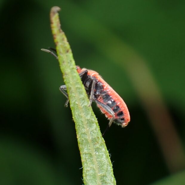 ボタンヅルを食べる赤と黒のマダラナガカメムシの仲間。 マダラナガカメムシ科は、 他にも赤と黒の鮮やかな色彩ものが多く、 模様の違いに注目しましょう。