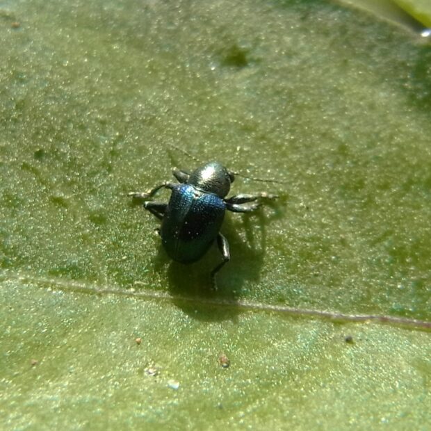 サルハムシの仲間。 体は小さく、 金属光沢のある銅色をしていますが、 変異があり青色のものもいます。 ヤブガラシなどの葉や茎を歩き回っている姿を普通に見ることができます。