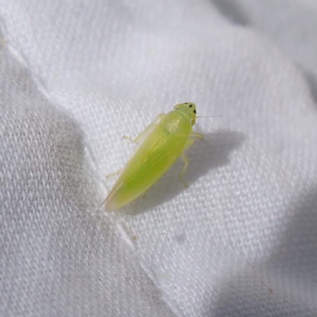 春に葉の上で普通に見られる小さなヨコバイ。 頭部の先端に黒い点が3個あり、 体の色は変異が見られます。 近づくと、 ピョンと跳ねて飛んで逃げます。 クワキヨコバイの仲間は細かく分類され、 多くの種類がいます。