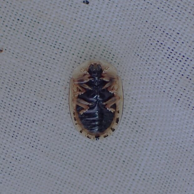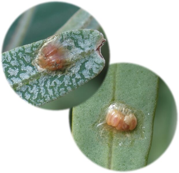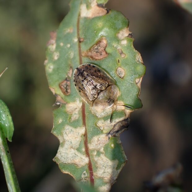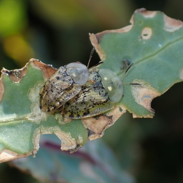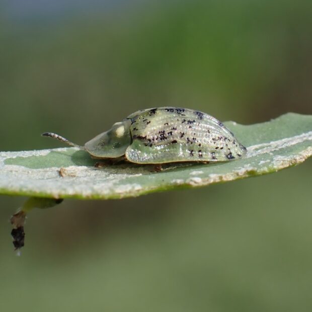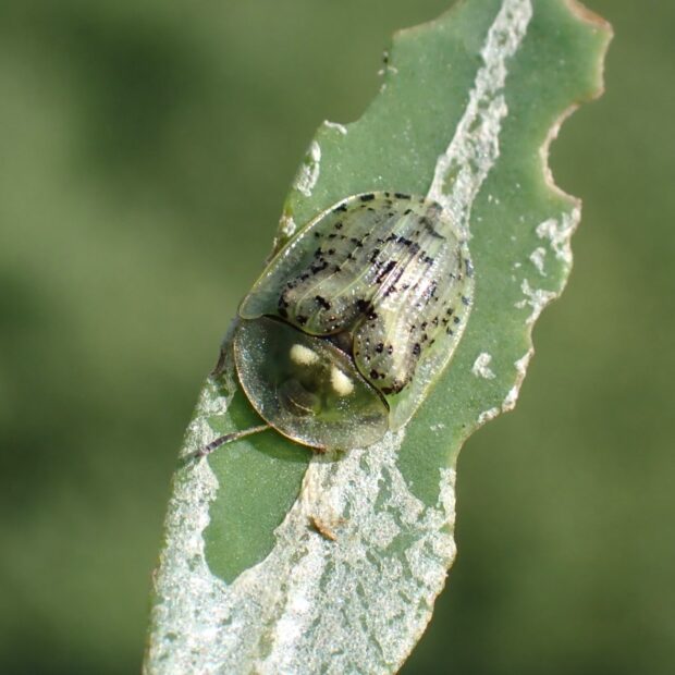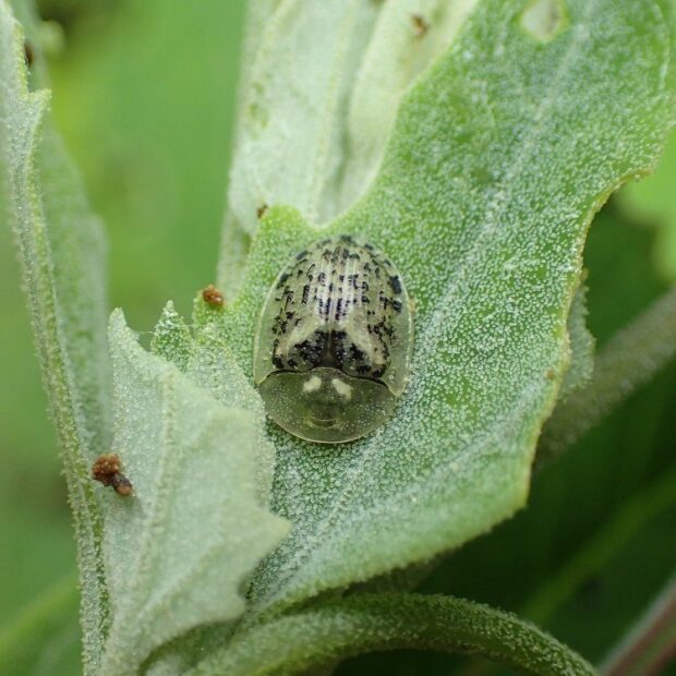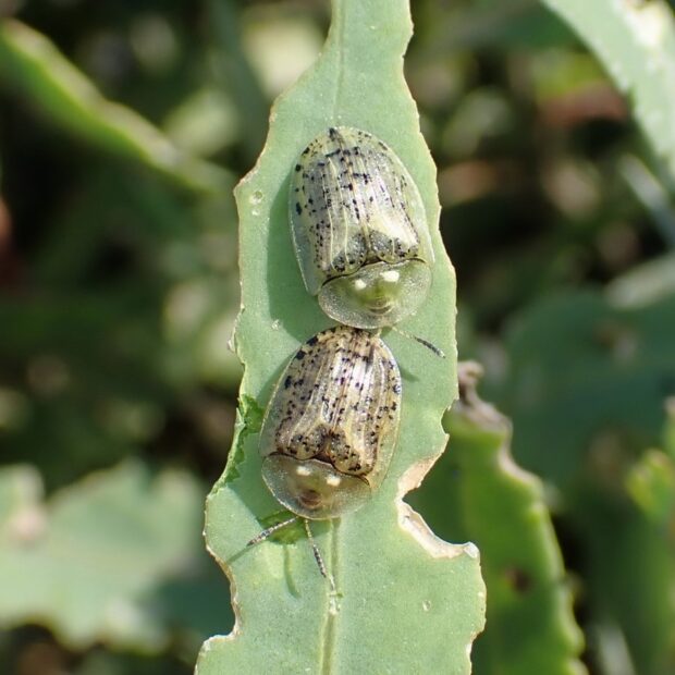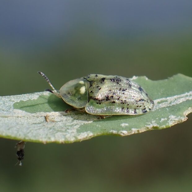 アカザ科の植物で見られるカメノコハムシの仲間。 楕円形で扁平な形をしており、 体の色は薄い緑色~黄褐色です。 幼虫は尾の先端に脱皮殻やフンをつけ、 カモフラージュしています。