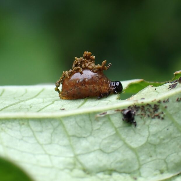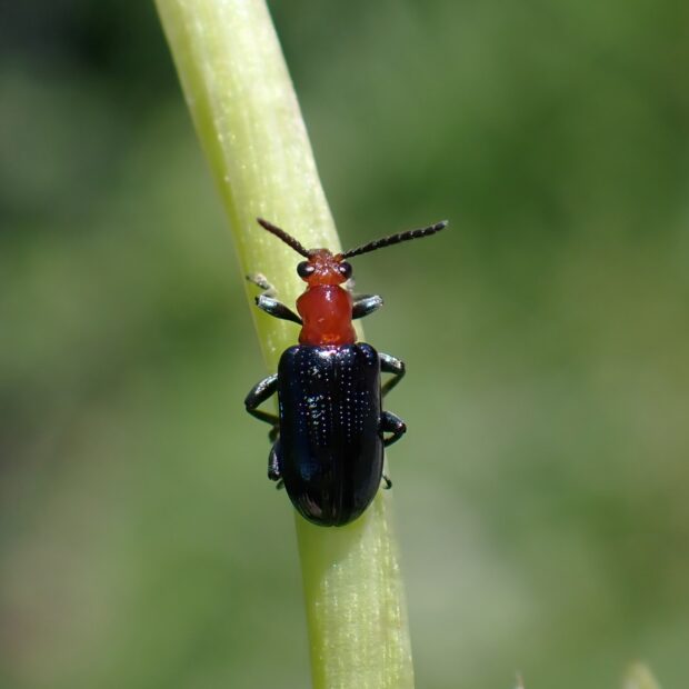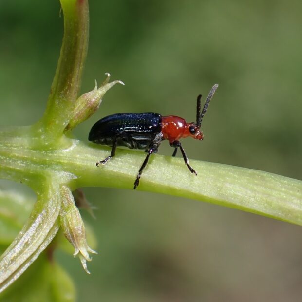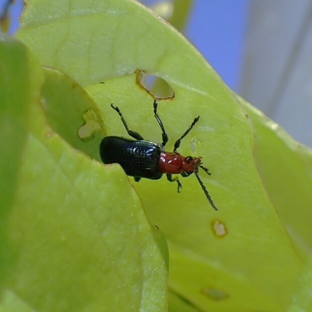 ヤマイモ類で普通に見られる小さなハムシ。 頭と胸は赤色で、 上翅(じょうし)は金属光沢がある藍色。 幼虫はふんで体をおおい、 身を守っています。