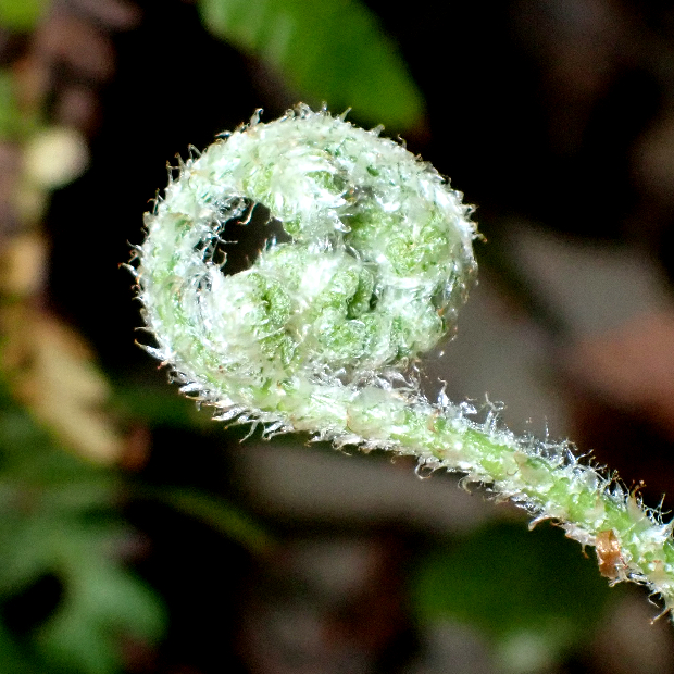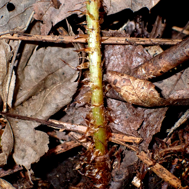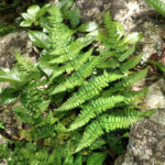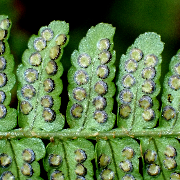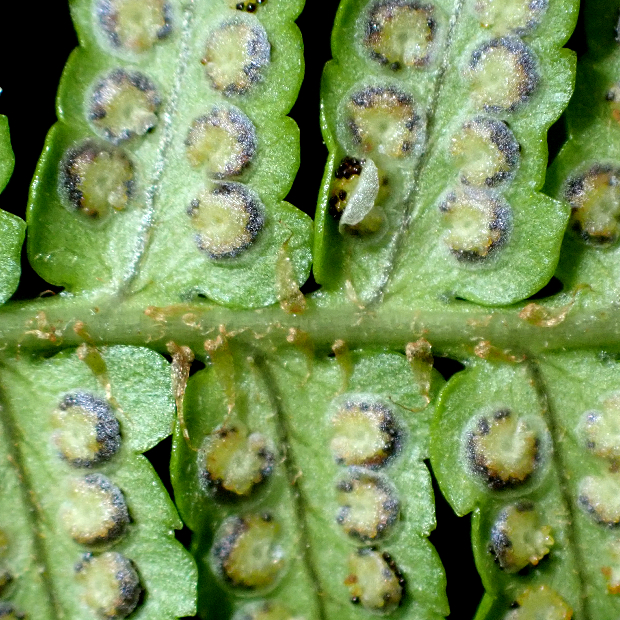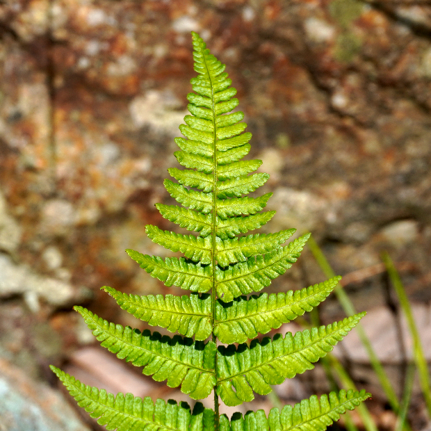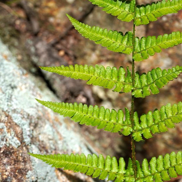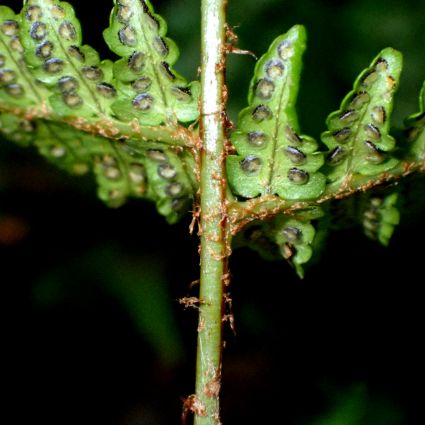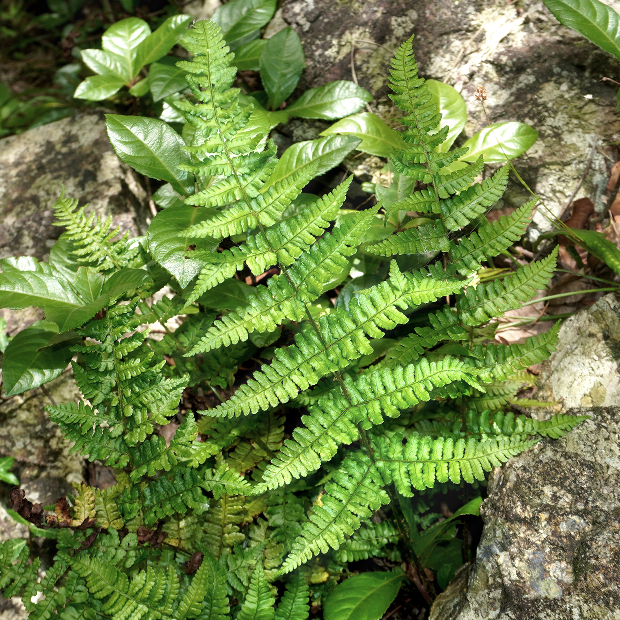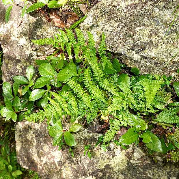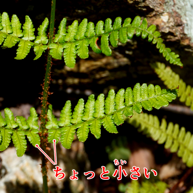 人工的な場所でよく見られる変わったシダ。 ベニシダに近い仲間で似ていますが、 葉はより厚くて細長めで、 軸部分に明るい茶色の鱗片が多めにつきます。 また、 若葉や若い包膜は紅色になりません。