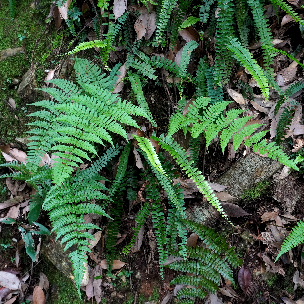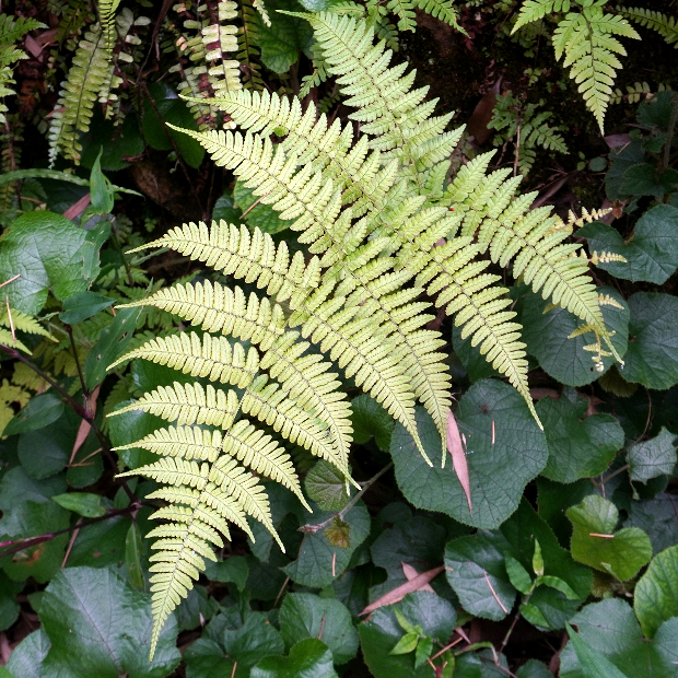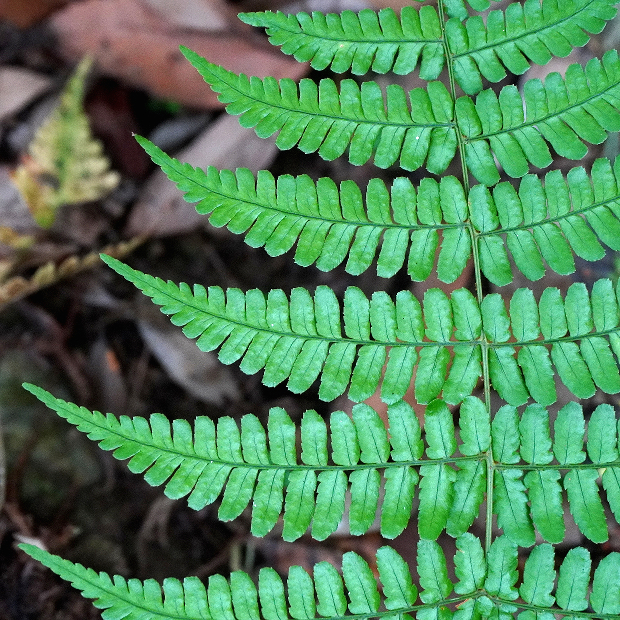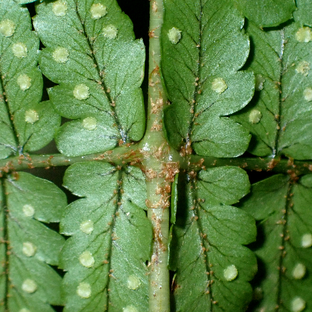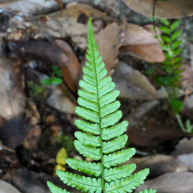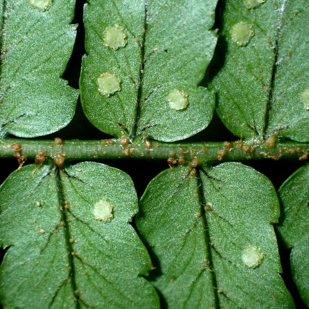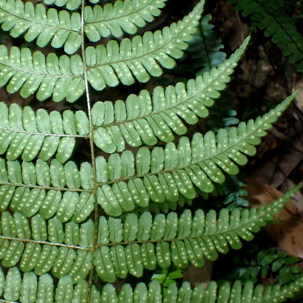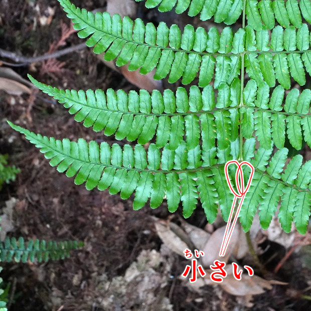 最下羽片の葉軸に接する下向き小羽片は、 となりの小羽片より小さい。
