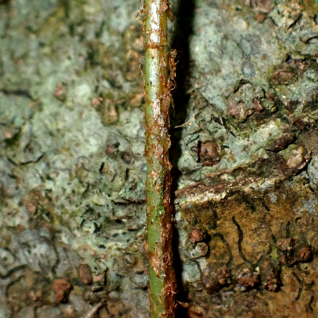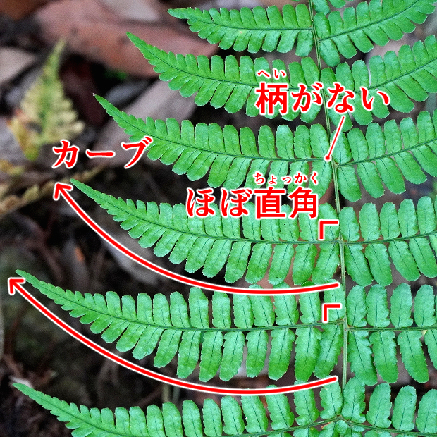 羽片は葉軸に対して直角につき、 基部にはっきりとした柄がない。 よく途中でカーブする。