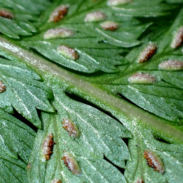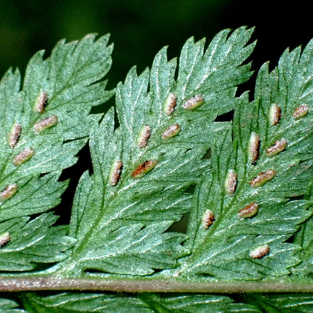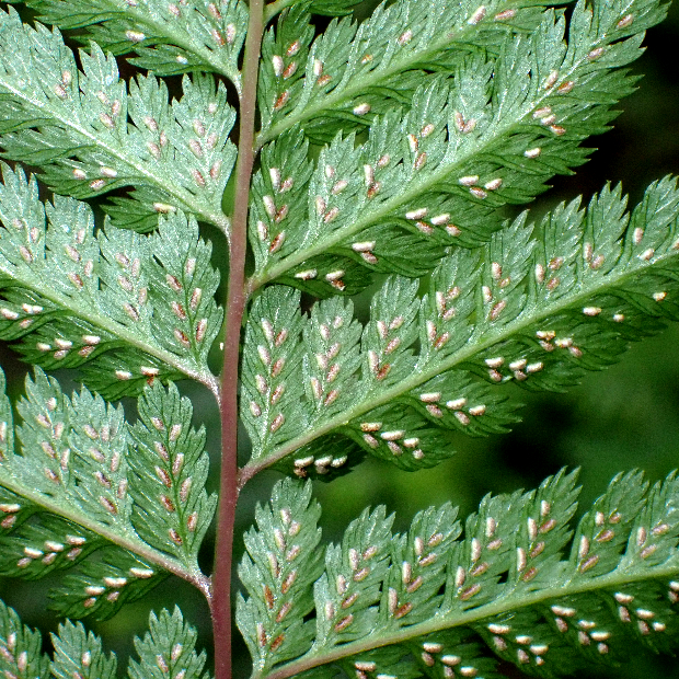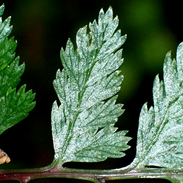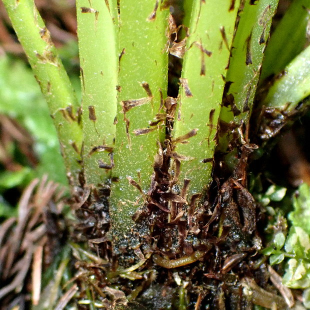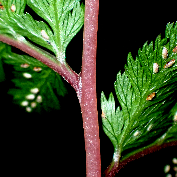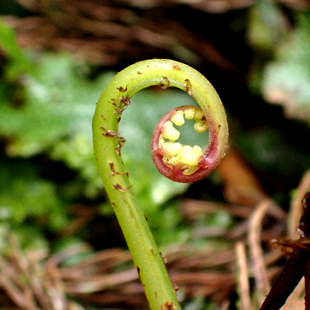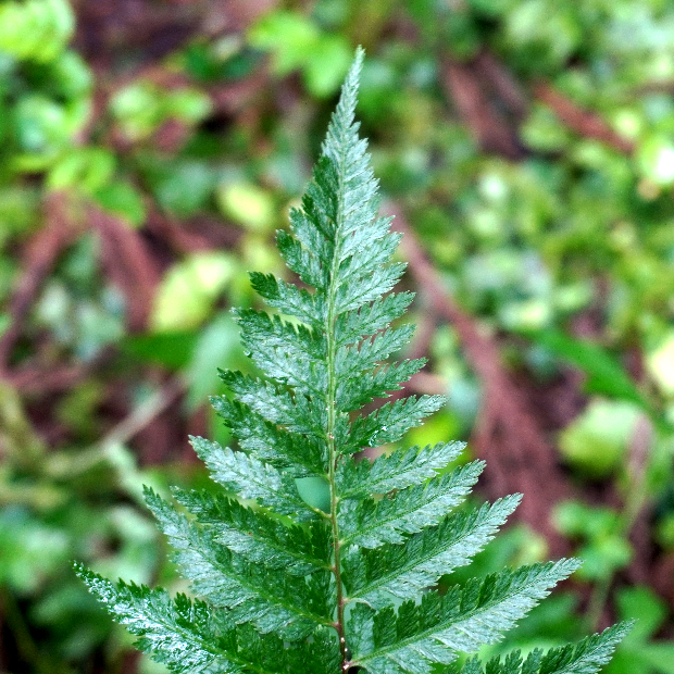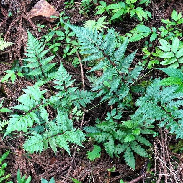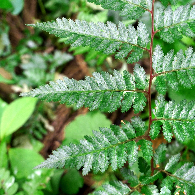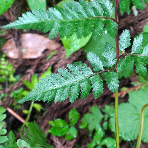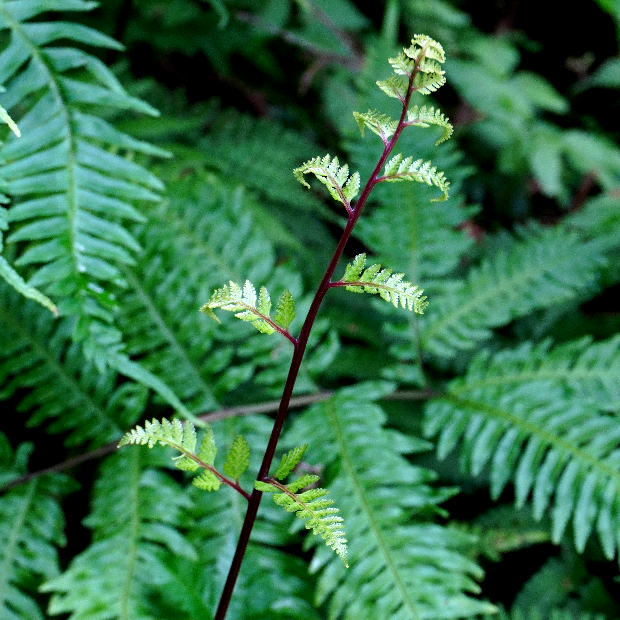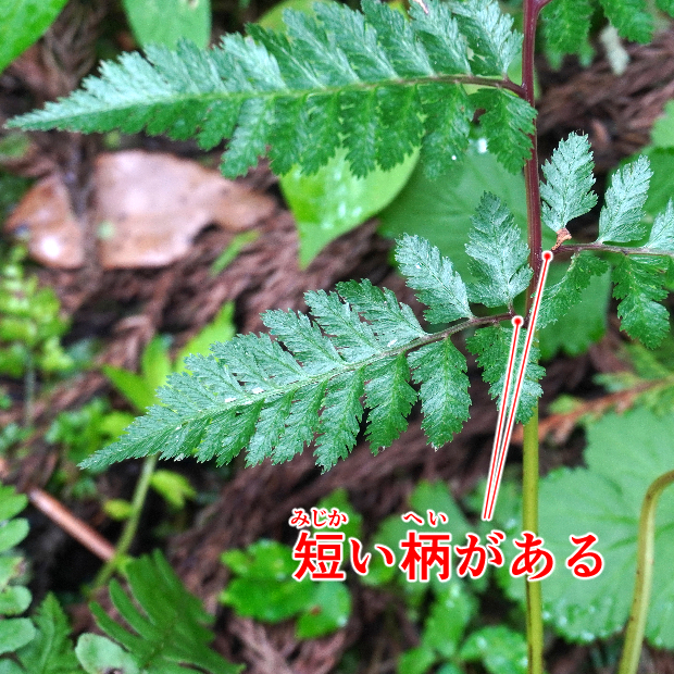 やわらかくてみずみずしいシダで、 湿った林内を好んで生えます。 葉軸は赤紫色なことが多くて美しく、 葉の表面に細長くてやわらかいトゲがたくさんあって、 触るとチクチクします。