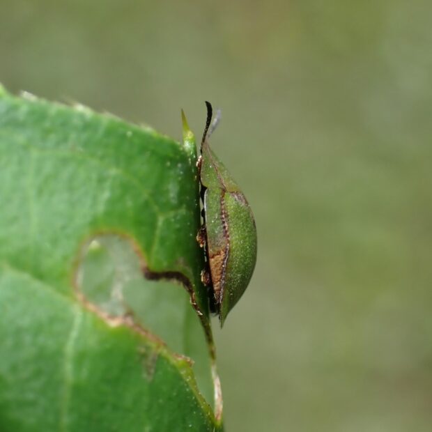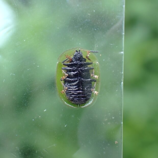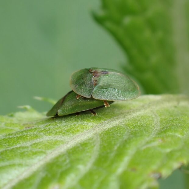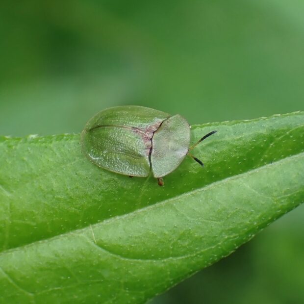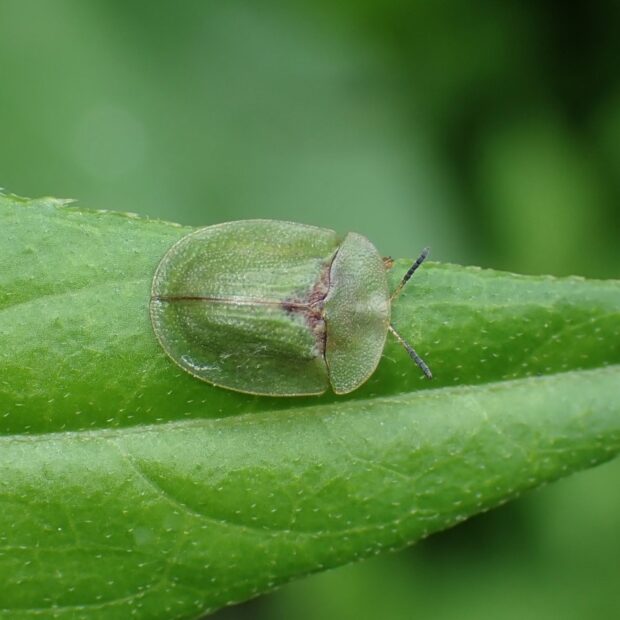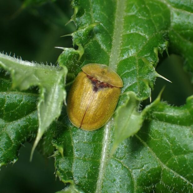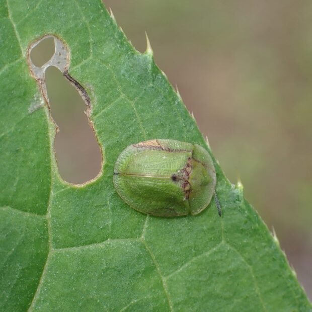平地から山地のアザミ類で見られるハムシ。 体は緑色で、 亀のような形をしているカメノコハムシの仲間。 似ているミドリカメノコハムシはヒメシロネなどのシソ科につきます。