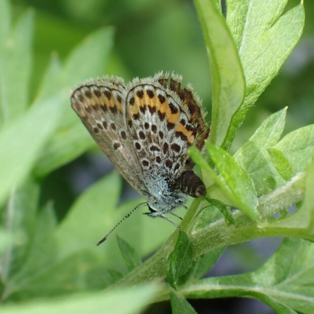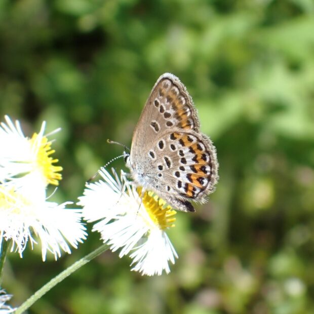 山の草原を飛ぶシジミチョウ