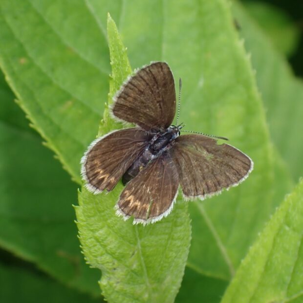山で見られるシジミチョウ。 日当たりのよい草はらで、 いろいろな花にやって来ます。 幼虫は広食性でいろいろな植物を食べます。