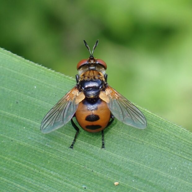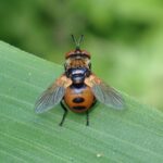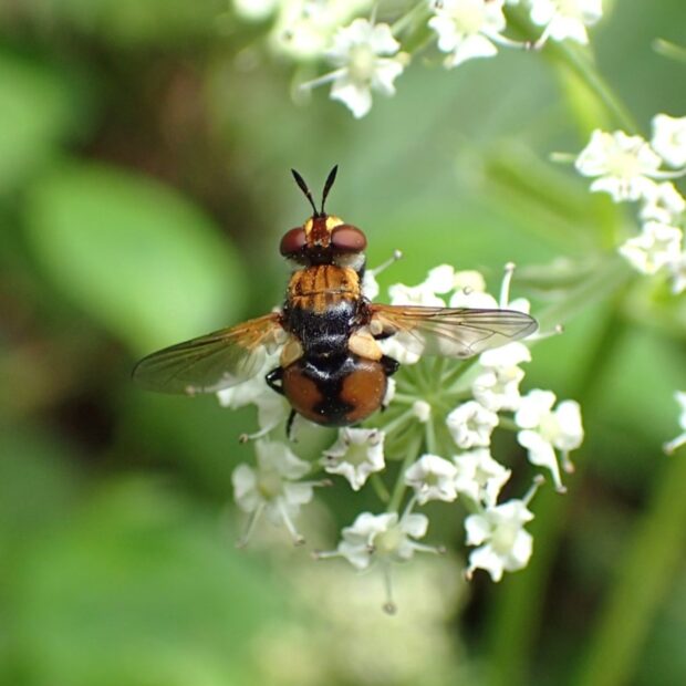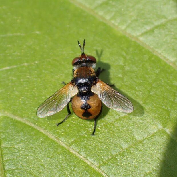 カメムシの仲間に寄生するヤドリバエの仲間。 別名マルボシヒラタハナバエ。 花によくやって来ます。 メスはカメムシの体に卵を産み、 ふ化した幼虫はカメムシの体の中で育ちます(内部寄生性)。