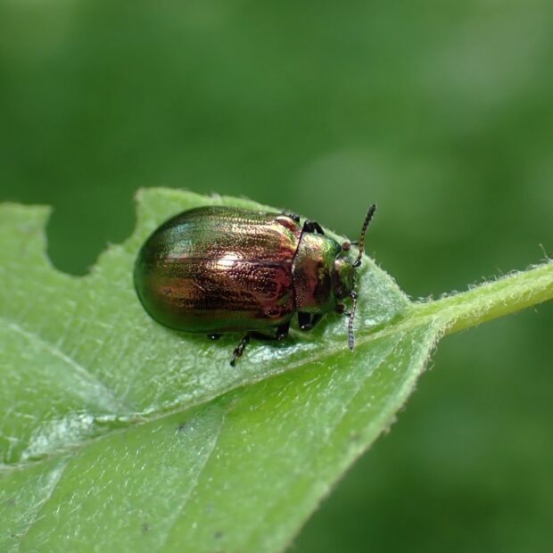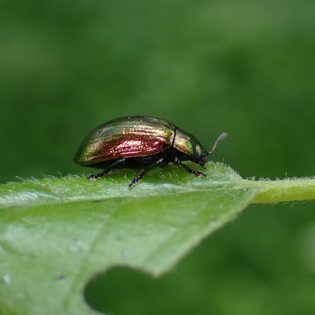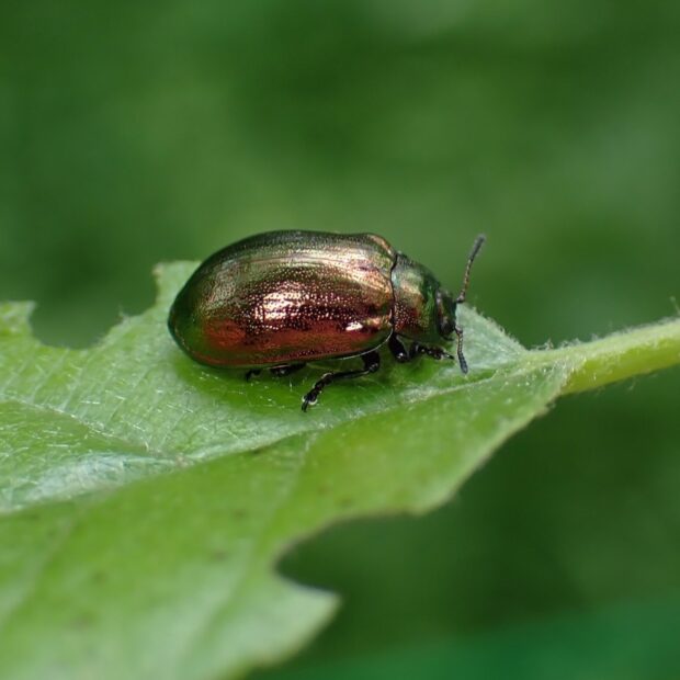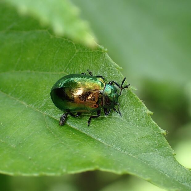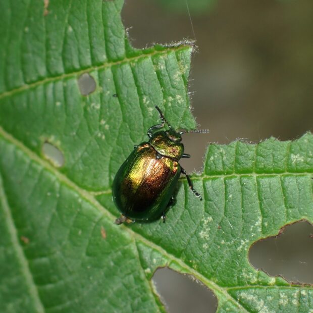 ハンノキなどで見られる金緑色の美しいハムシ。 光沢があり、 ずんぐりした体型。 地域により、 赤銅色、 藍色など、 色の変異が見られます。