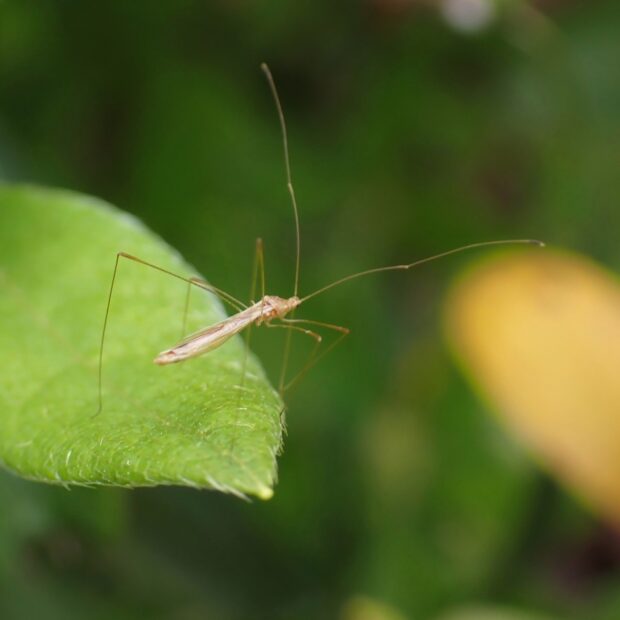 体はほっそり、 触角とあしは糸のように細いカメムシ。 触角は体長より長く、 先の方が黒くこん棒状。 ヒメイトカメムシに似ていますが、 本種はより大型で細長く、 触角とあしの紋が不明瞭です。