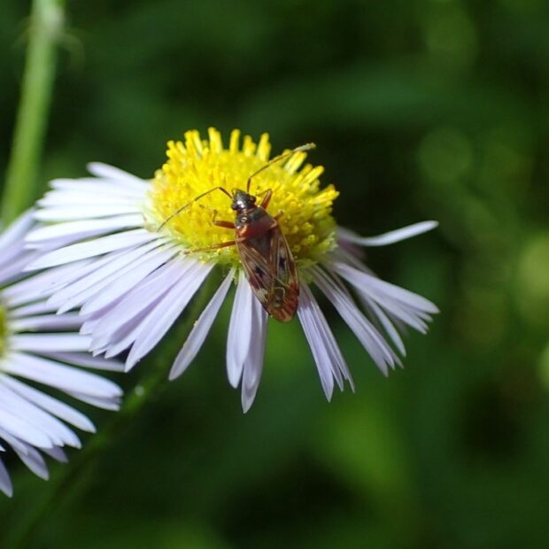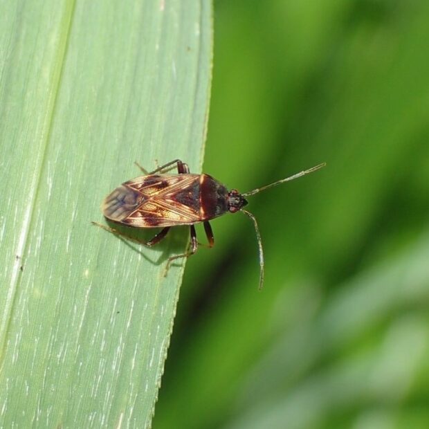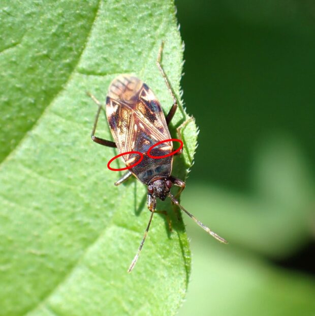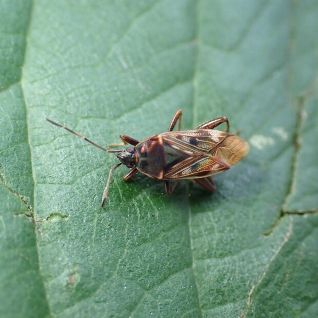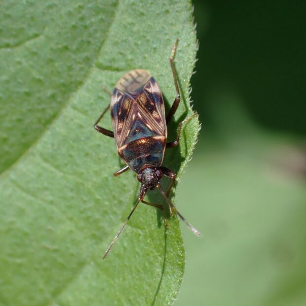 ナガカメムシの仲間。 光沢のある暗褐色の体に黒や黄白色の複雑な模様があります。 ハンノキなど様々な植物の実を吸汁します。