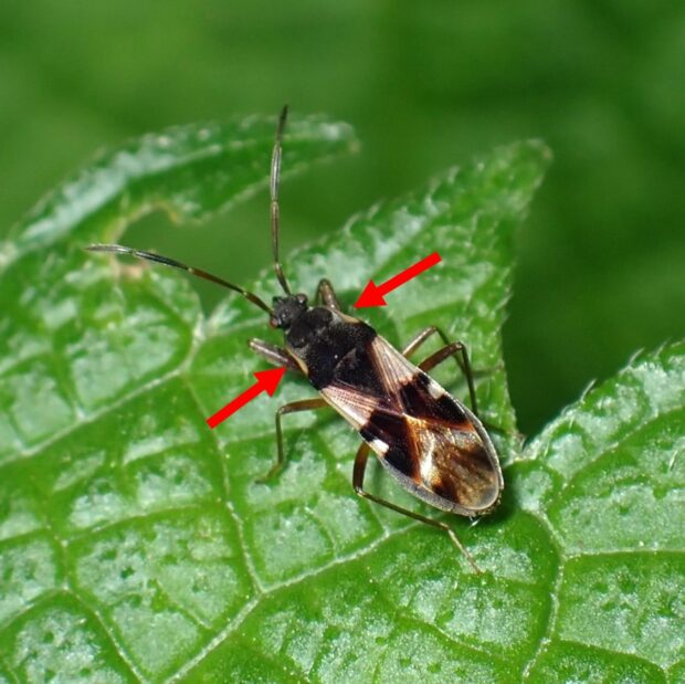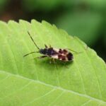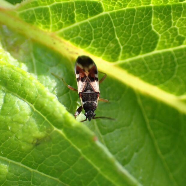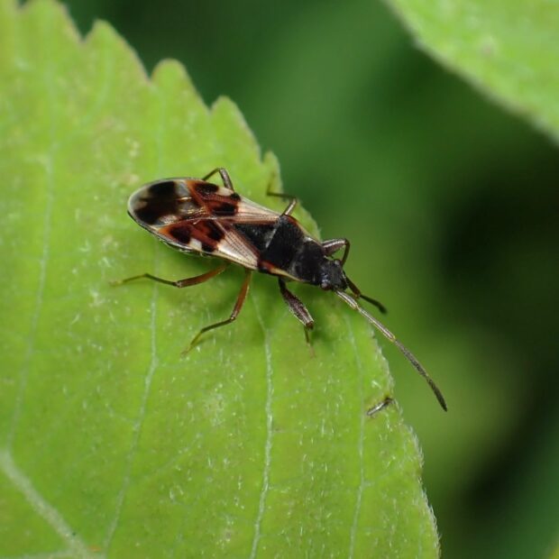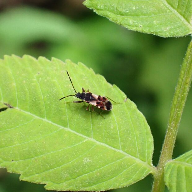 ナガカメムシの仲間。 黒色と茶色と黄白色の複雑な模様がある小さなカメムシ。 ヤマグワ、 ニワトコなどの実を吸汁します。