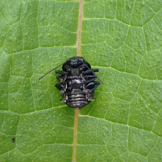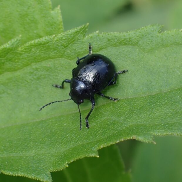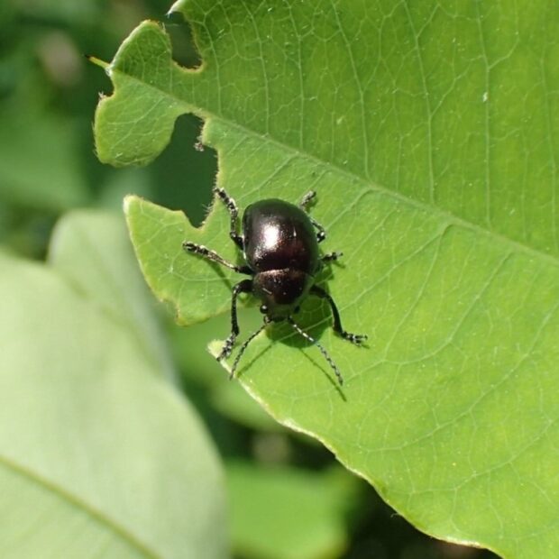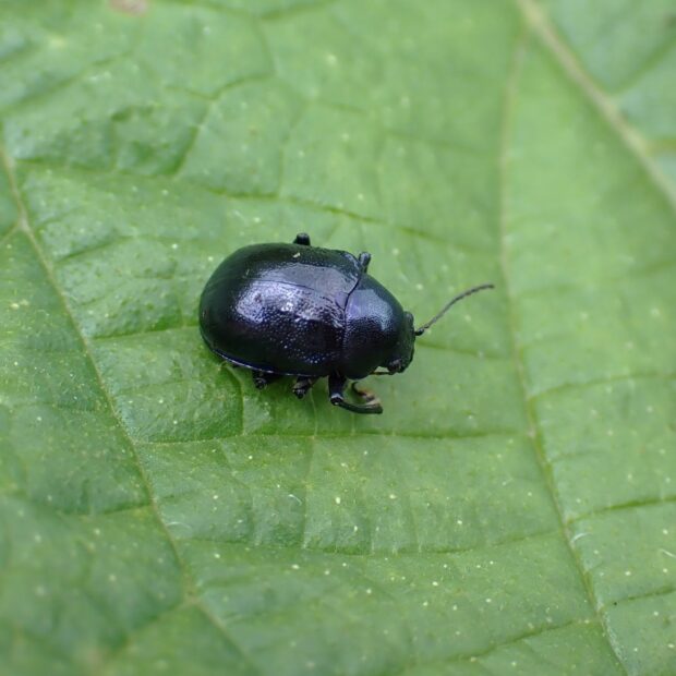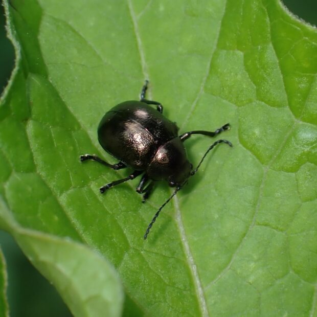 サツマイモやヒルガオの葉を食べるハムシ。 丸っこい体型で、 藍色、 銅色、 金緑色などの光沢があります。