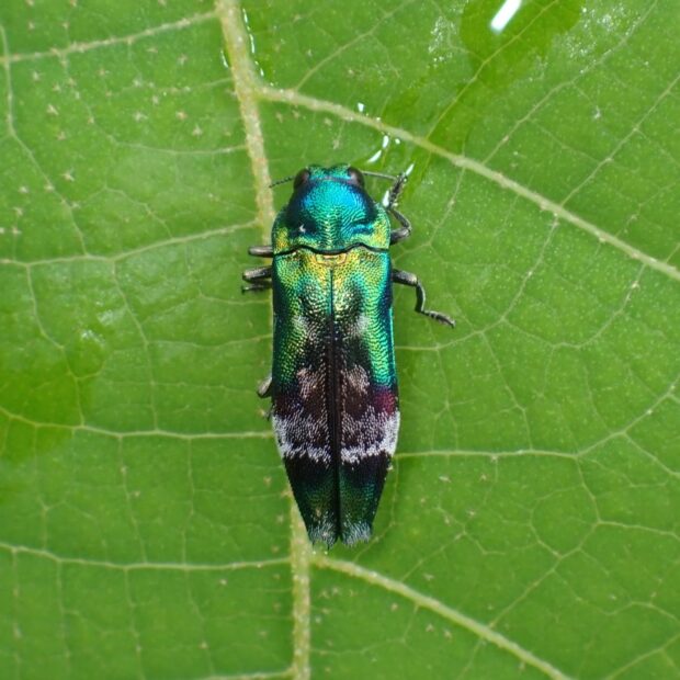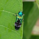 ナカボソタマムシの仲間。 アカメガシワの葉の上でよく見られます。 見る角度により、 緑、 青、 金色、 赤紫色と色の変化が見られ、 とても美しいです。