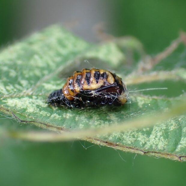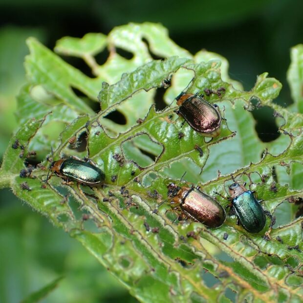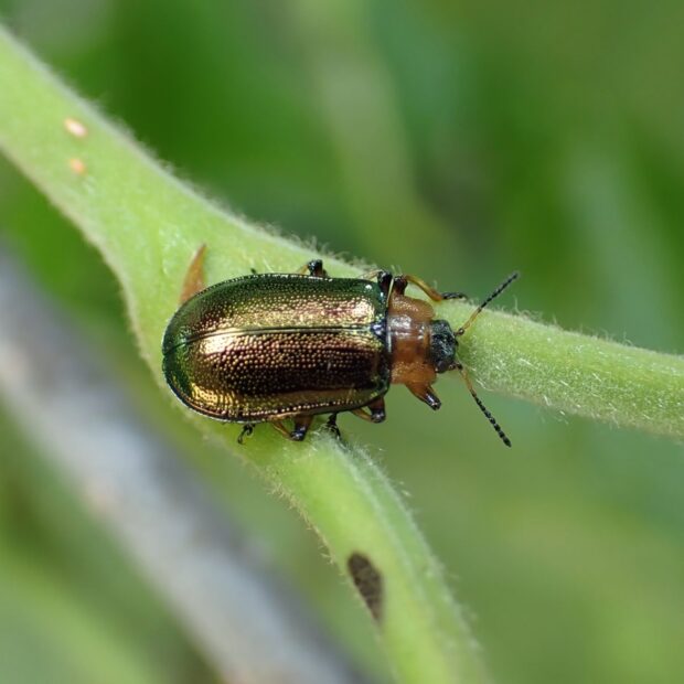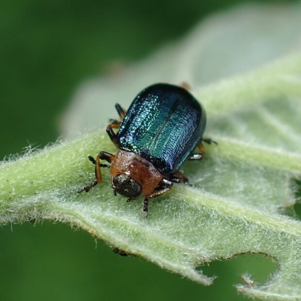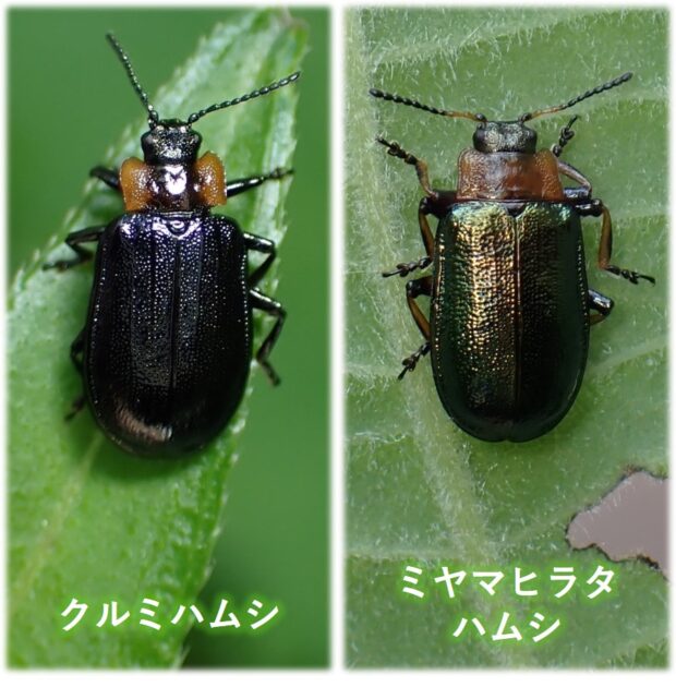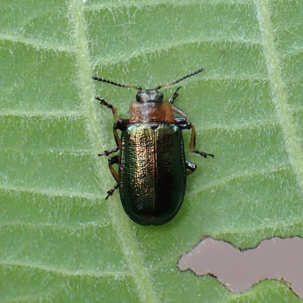 カバノキ科の葉を食べるハムシ。 体は平たく、 前胸はオレンジ色、 上翅は金緑、 藍色、 銅色と変化が見られます。 幼虫、 成虫ともに葉に穴をあけて食べます。