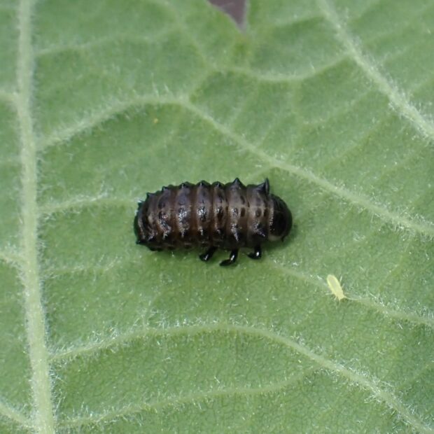 クルミハムシは、 クルミ類の葉を食べる。 前胸はオレンジ色で真ん中が黒っぽい。 触角は黒い。