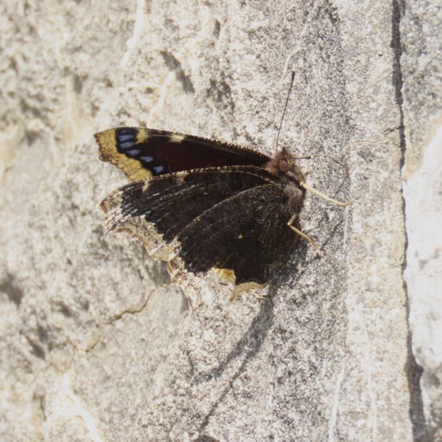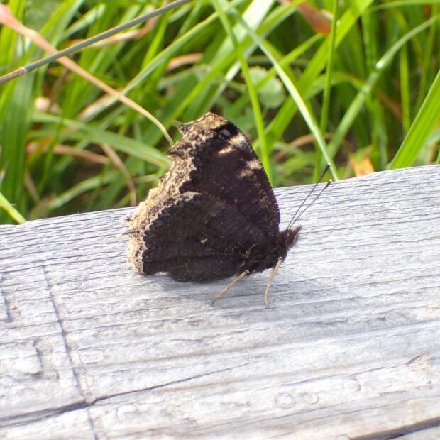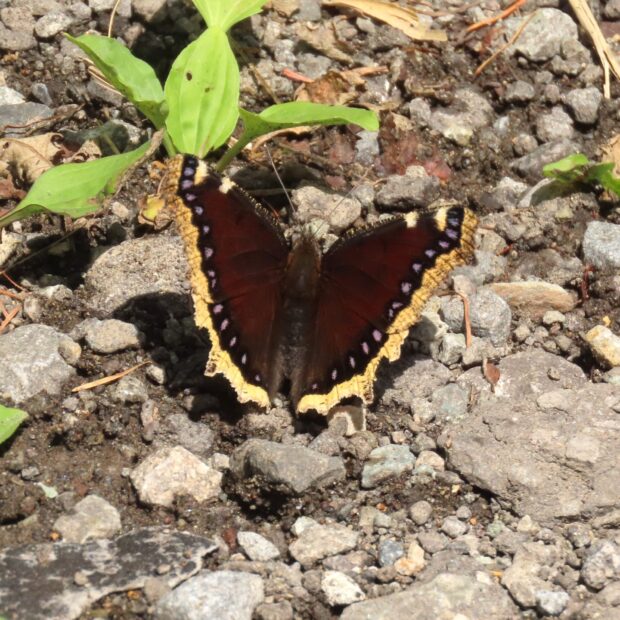 黄色い太いふちどりがある茶色いタテハチョウ。 本州では山岳地帯(1,000m以上)、 北海道では平地~山で見られます。 花に来ることはなく、 敏速に跳びます。 8月頃発生し、 そのまま成虫で越冬します(寿命は長く11か月ほど)。 アメリカではその姿から「喪服の外套(Mourning Cloak)」とよばれています。