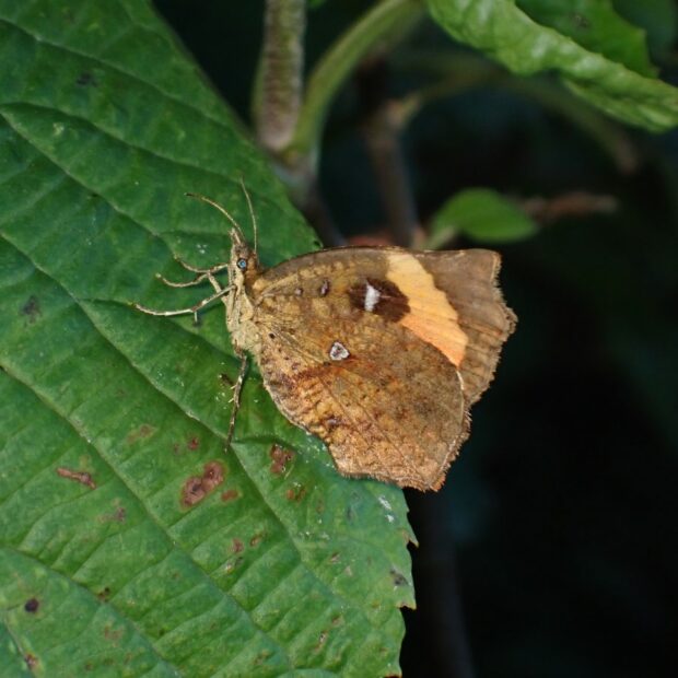 山で見られる昼行性のガ。 前ばねにあるオレンジ色のいかりの形の紋が名前の由来になっています。 日中さかんに飛び、 花にやって来ます。