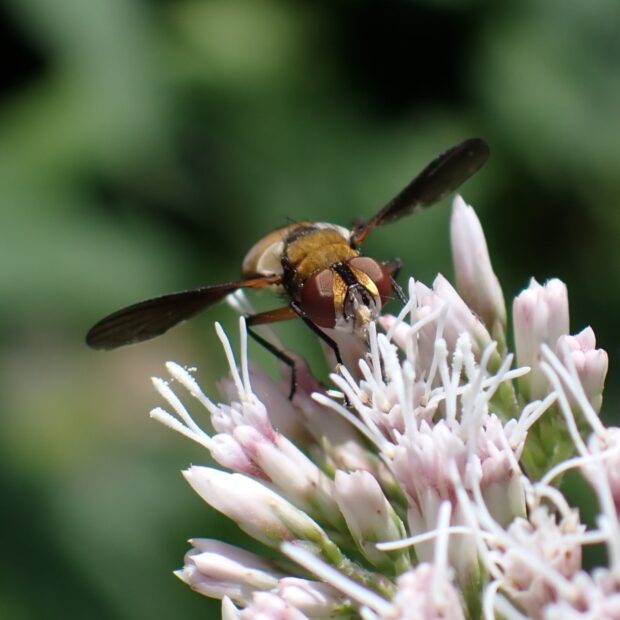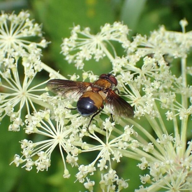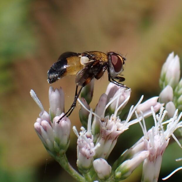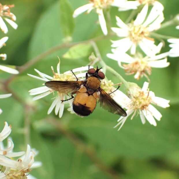 ヤドリバエの仲間。 平地~山で見られ、 花によくやって来ます。 体は黄褐色で、 腹部の下の方が黒色ですが、 この模様には変異があります。 幼虫はカメムシの仲間に寄生します。