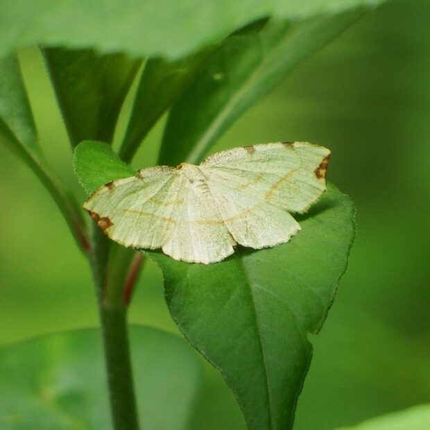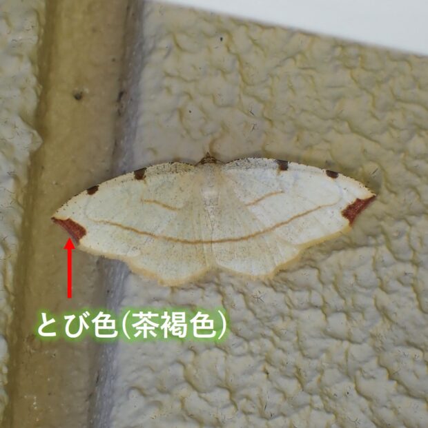 エダシャクの仲間。 前ばねの先端あたりにとび色(茶褐色)の部分があり、 「ツマトビ」の名前の由来になっています。 前ばね前縁には2個の茶褐色の紋があります。
