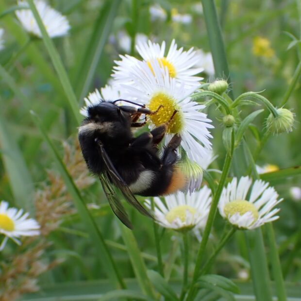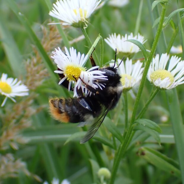 いろいろな花を訪れる山地性のマルハナバチ。 黒色の毛でおおわれ、 黄白色の毛の帯があり、 腹部先端はオレンジ色。 女王バチと働きバチからなる家族で巣をつくる社会性のハチ。 舌が短いため、 奥の方に蜜がある花は、 穴をあけて蜜を盗むことがあります。