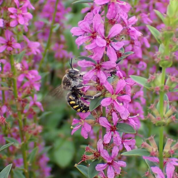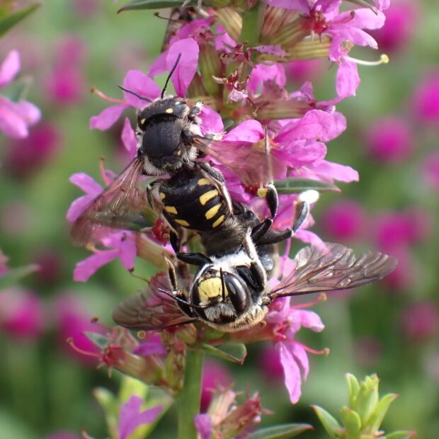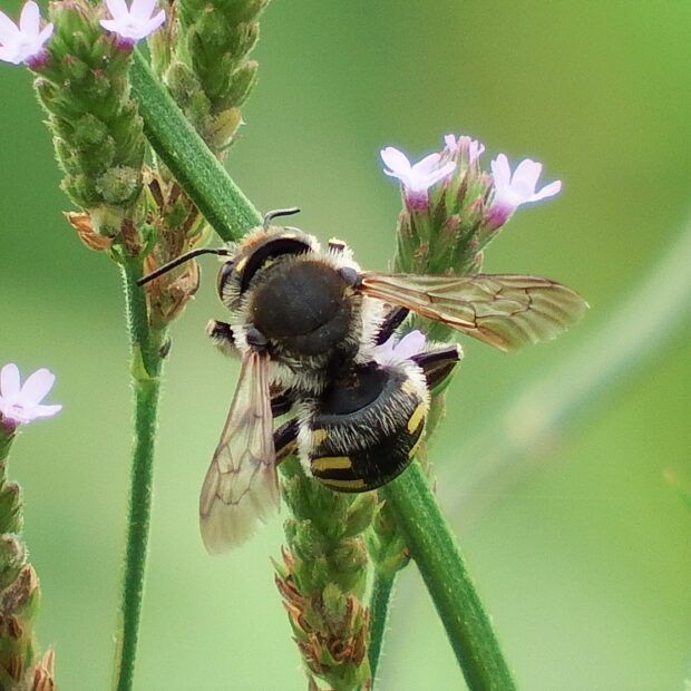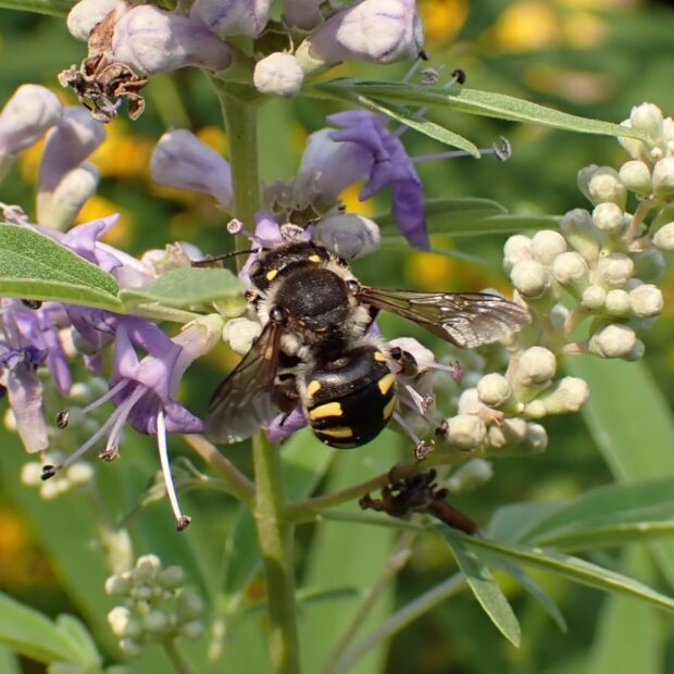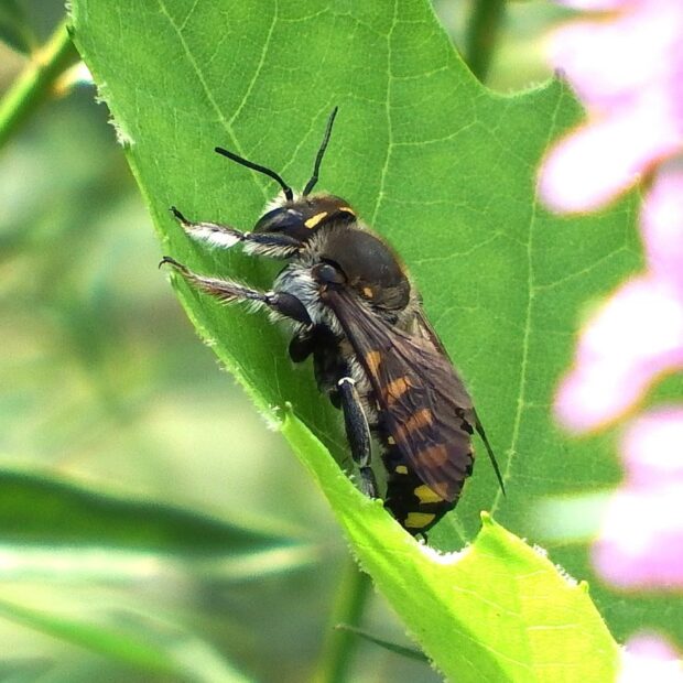 ハキリバチ科(あるいはミツバチ科)。 メスは腹部第1~5節に5対の黄色の紋(10個)があり「トモン」と名づけられました。 オスは第6節にも紋があり12個の黄色い紋があります。 真夏に現れ、 竹筒などのあなにヨモギなどの毛で巣を作ります。