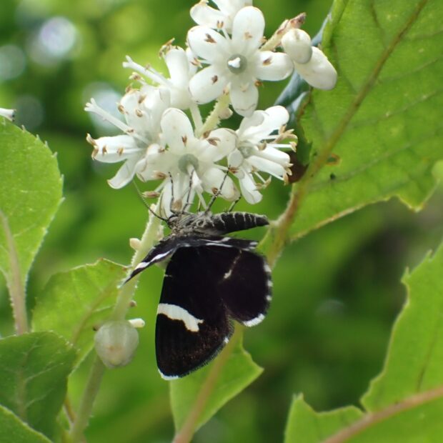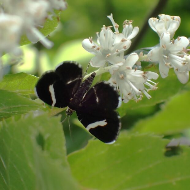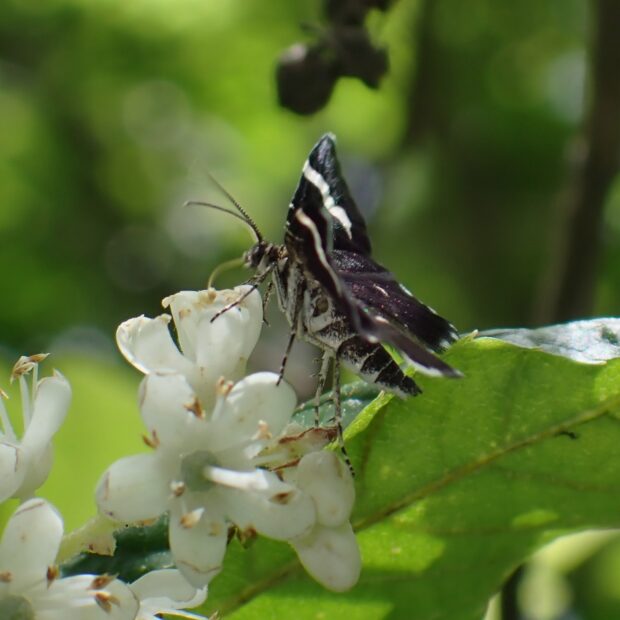 山で見られる昼行性のガ。 沢沿いの林道などで、 昼間にヒラヒラとよく飛び、 花を訪れます。 黒色のはねに白い帯や模様が特徴的ですが、 個体変異が大きいです。