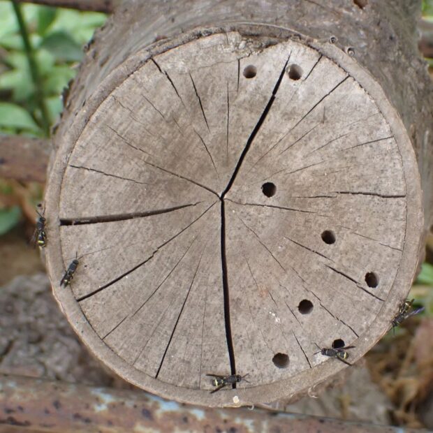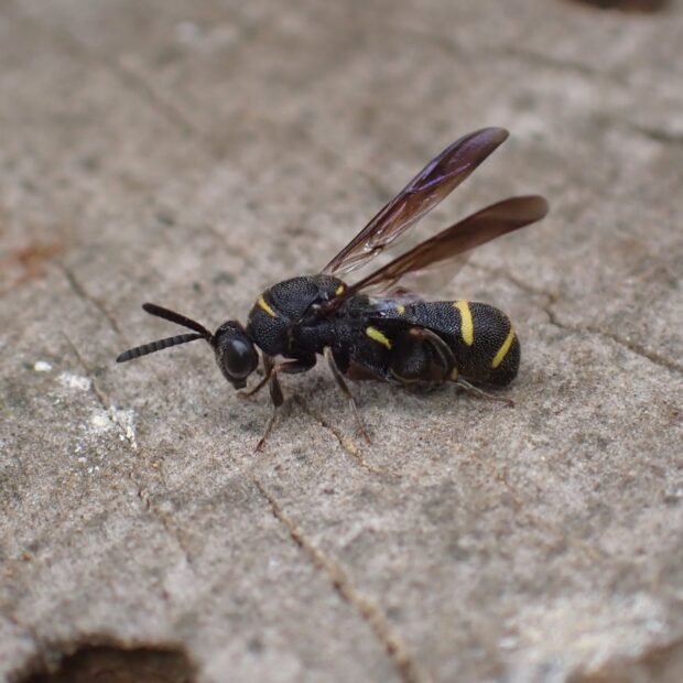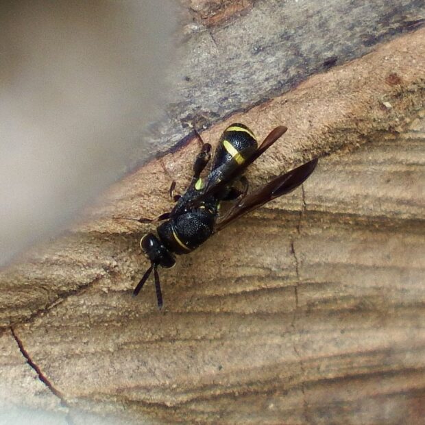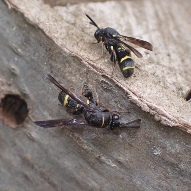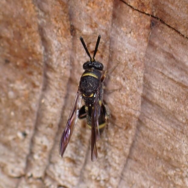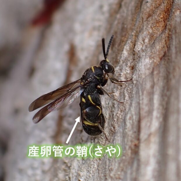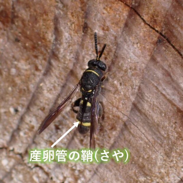 シリアゲコバチ科の仲間で、 本土ではシリアゲコバチとオキナワシリアゲコバチが見られます。 木の中で育つハチの幼虫や蛹に卵を産みつける寄生バチ。 メスが産卵管(鞘)を背負う姿から「シリアゲ」と名づけられました。