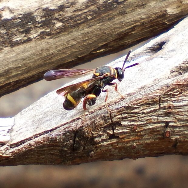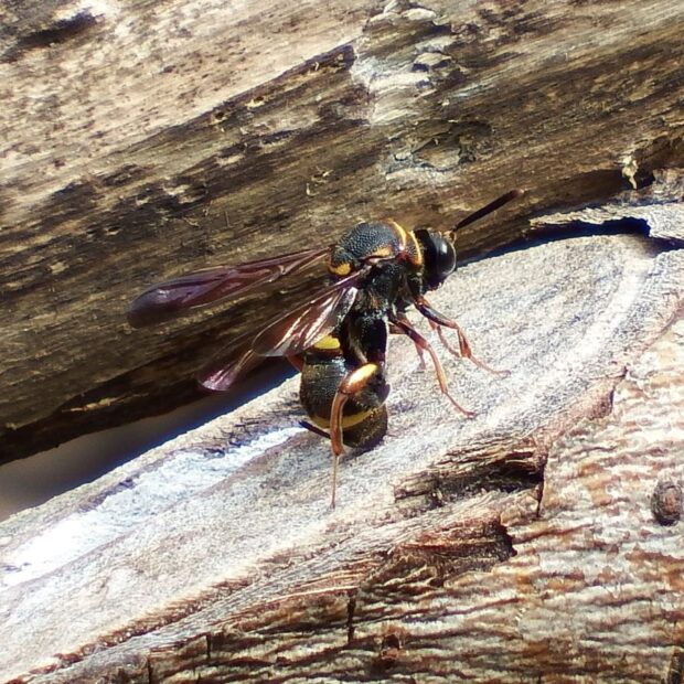 シリアゲコバチ科の仲間で、 本土ではシリアゲコバチとオキナワシリアゲコバチが見られます。 オキナワシリアゲコバチの産卵管(鞘)は短く、 腹の中ほどまでしかありません。 木の中で育つハチの幼虫や蛹に卵を産みつける寄生バチ。