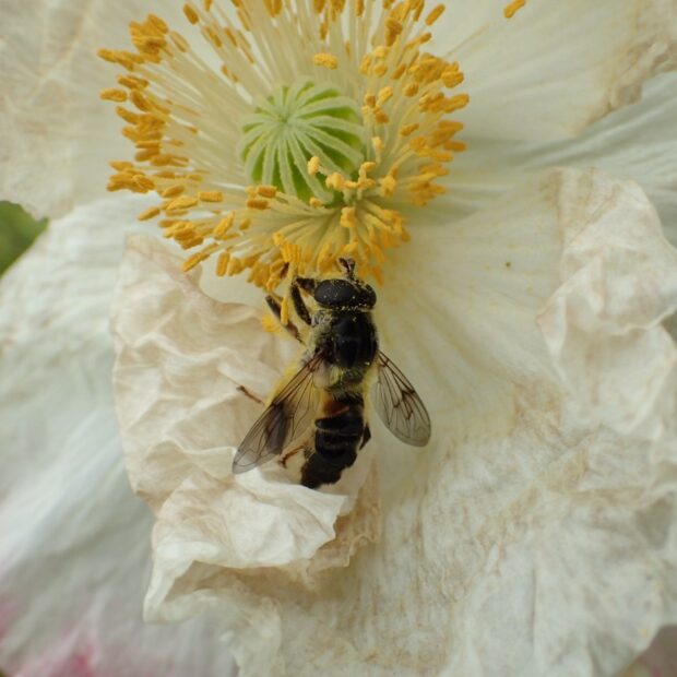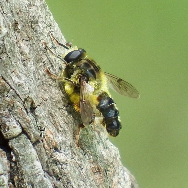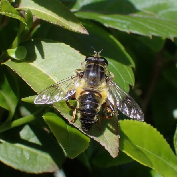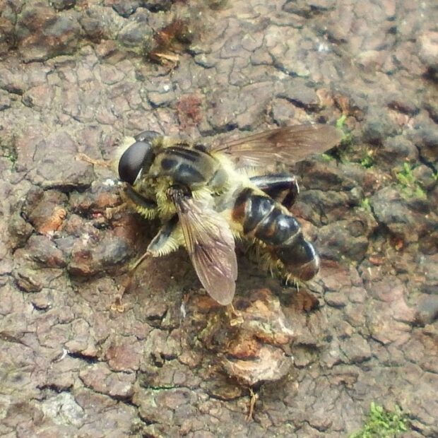 ハナアブ科ハラブトハナアブの仲間。 後あしの腿節が太く、 はねのつけ根付近に黄色い毛が密集しています。 タカサゴは、 兵庫県の高砂市に因んでいます。
