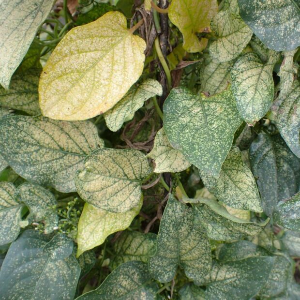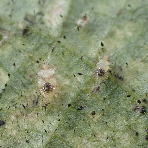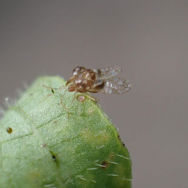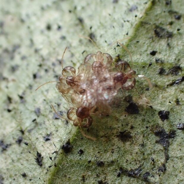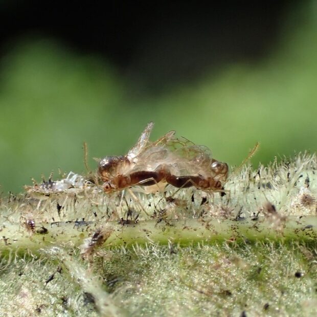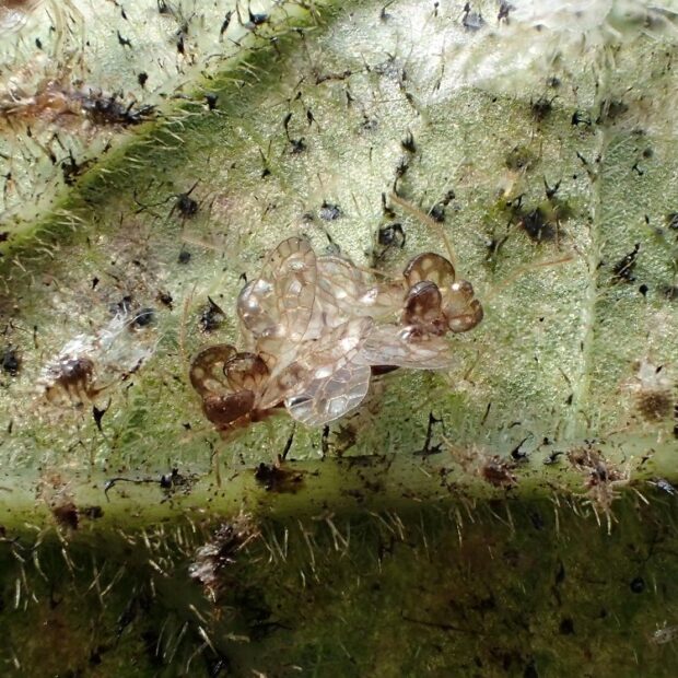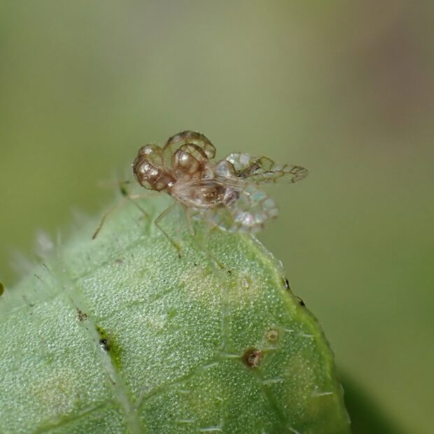 ヘクソカズラの汁を吸うグンバイムシ。 1996年に大阪府池田市で最初に発見された外来種。 丸い風船のような袋をつけ、 面白い姿をしています。 名前は形が相撲の軍配に似ていることからつけられました。