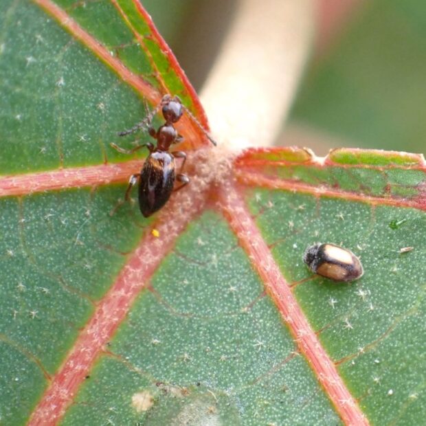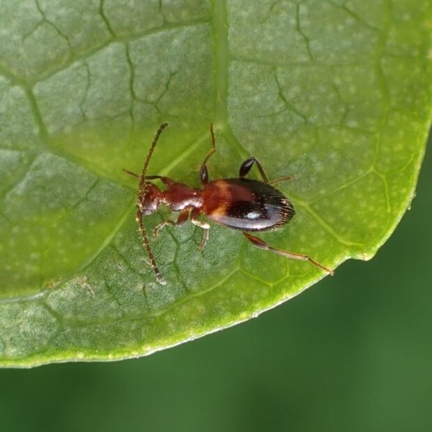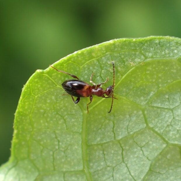 アリに擬態したアリモドキ科の仲間。 上翅(じょうし)は黒色で光沢があり、 基部に橙色のV字状の模様があります。 頭や胸は赤褐色です。 樹木の葉の上を活発に歩き回ります。