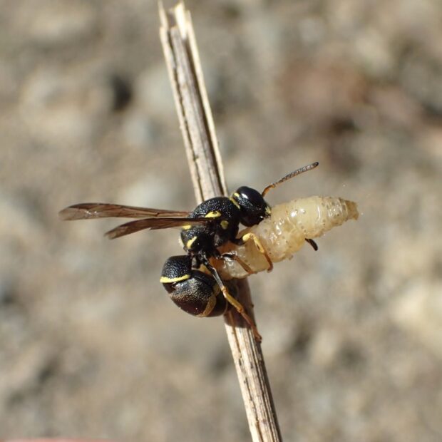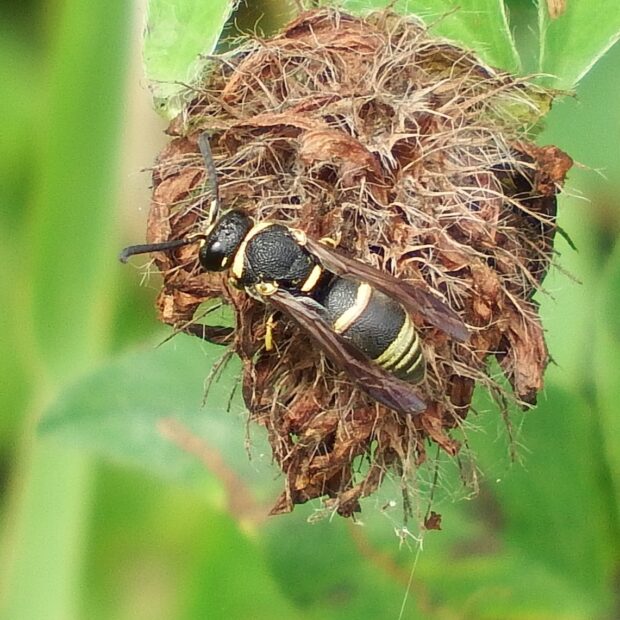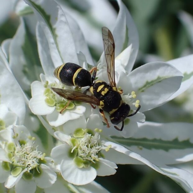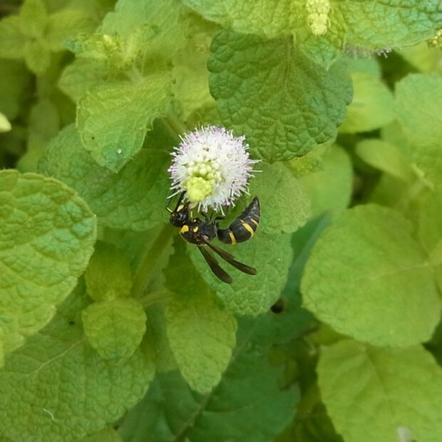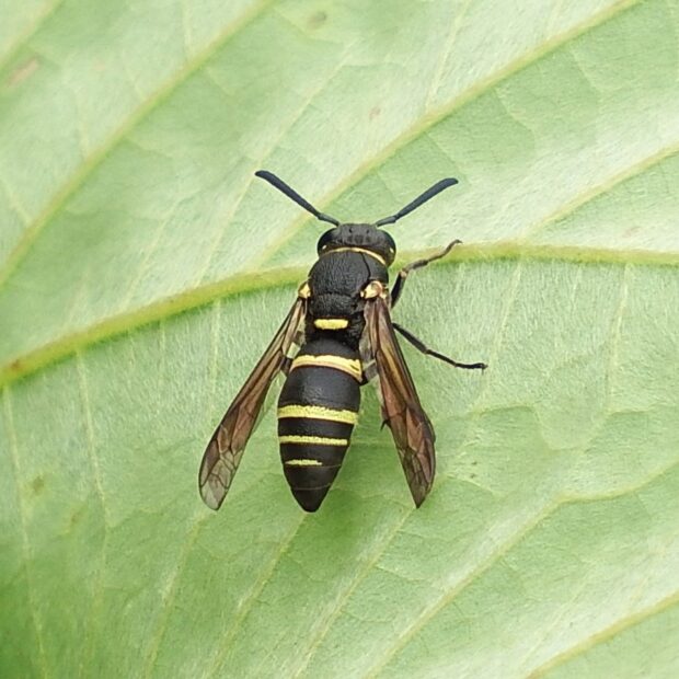 ドロバチ科の仲間。 胸や腹部の黄色い模様には個体差があります。 竹筒や木のあななどに泥で仕切った巣をつくります。 幼虫のエサとしてガの幼虫を狩り、 麻酔をして巣に運びます。 黄帯が多く華やかに見えるためミカドという名がつけられたとのこと。