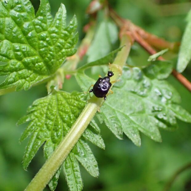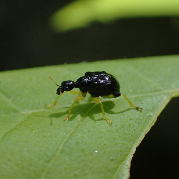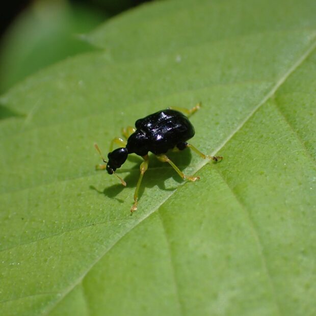 山で見られるオトシブミ科の仲間。 体色は光沢のある黒色、 触角とあしは黄色です。 上翅にコブがあり、 後あし腿節の一部が黒くなっているのが特徴。 メスはコアカソなどの葉を巻き揺籃を作り、 その中に卵を産みます。
