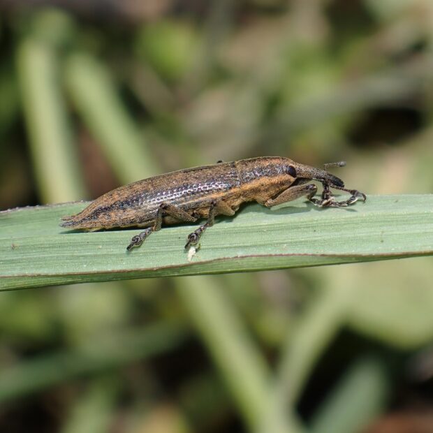 湿地のセリ科植物で見られるカツオゾウムシ。 細長い体型で、 上翅の先端が鋭くとがっています。 体色は黒色ですが、 黄褐色の鱗片をまとっているため、 黄褐色に見えます。 産地は局地的で少ないです。